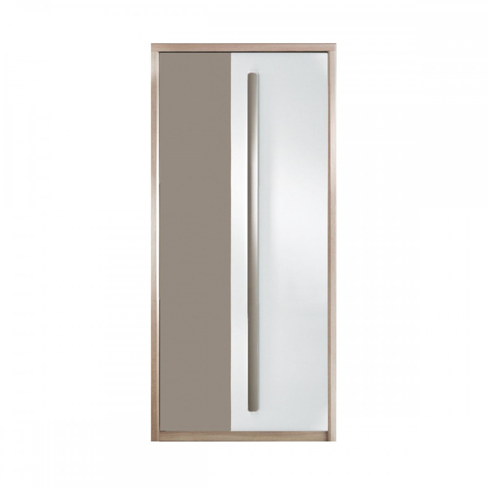 Elle dispose d'une porte blanc brillant avec une poignée taupe et d'un battant taupe.