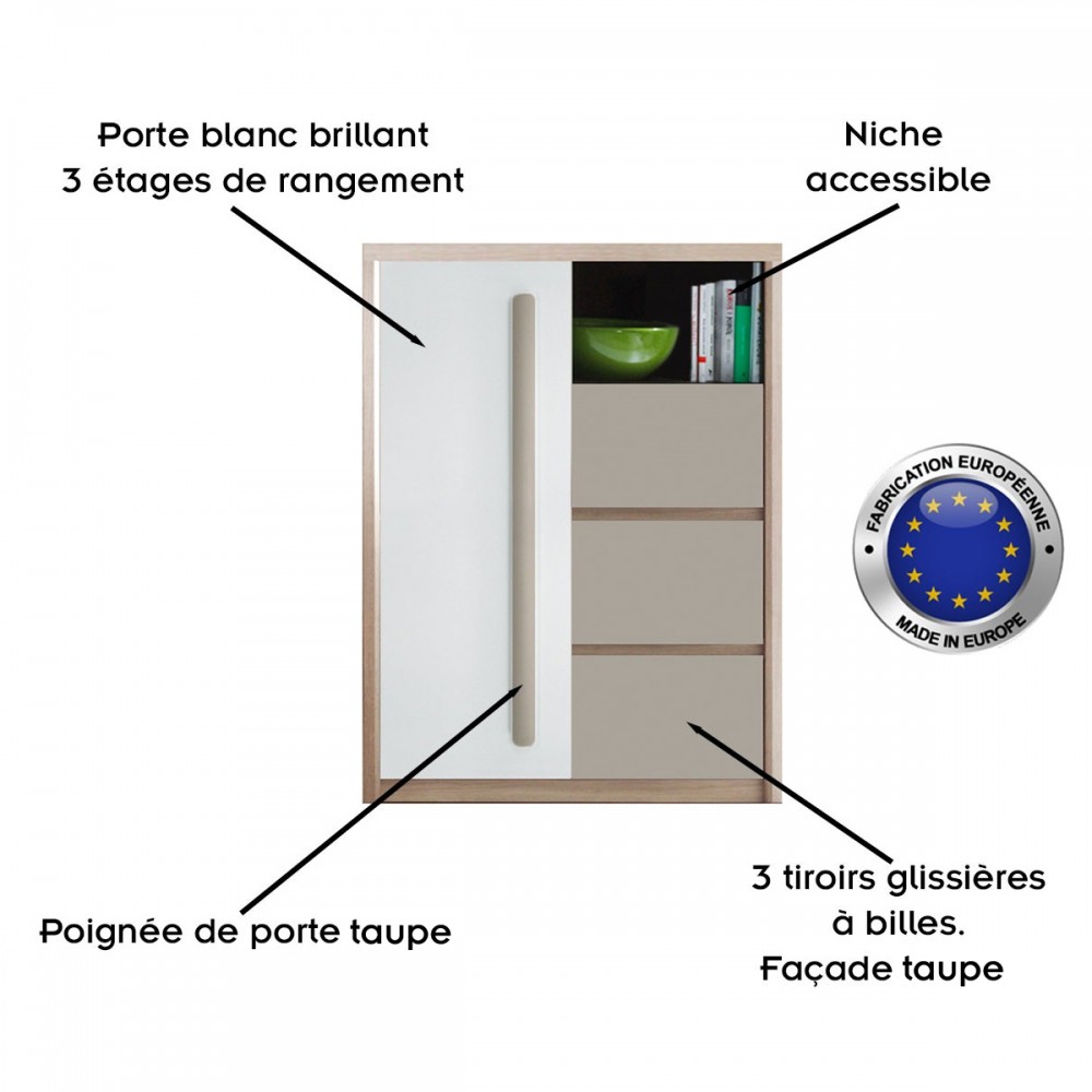 | bulletpointA | Buffet commode avec 1 porte battante, 1 niche et 3 tiroirs coulissants. |