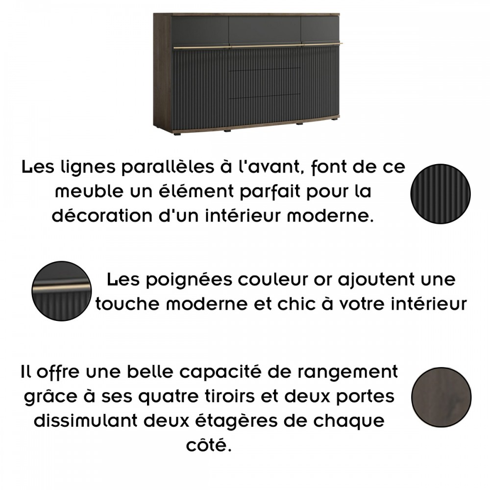 | bulletpointB | Il offre une belle capacité de rangement grâce à ses 4 tiroirs et 2 portes dissimulant deux étagères de chaque côté. |