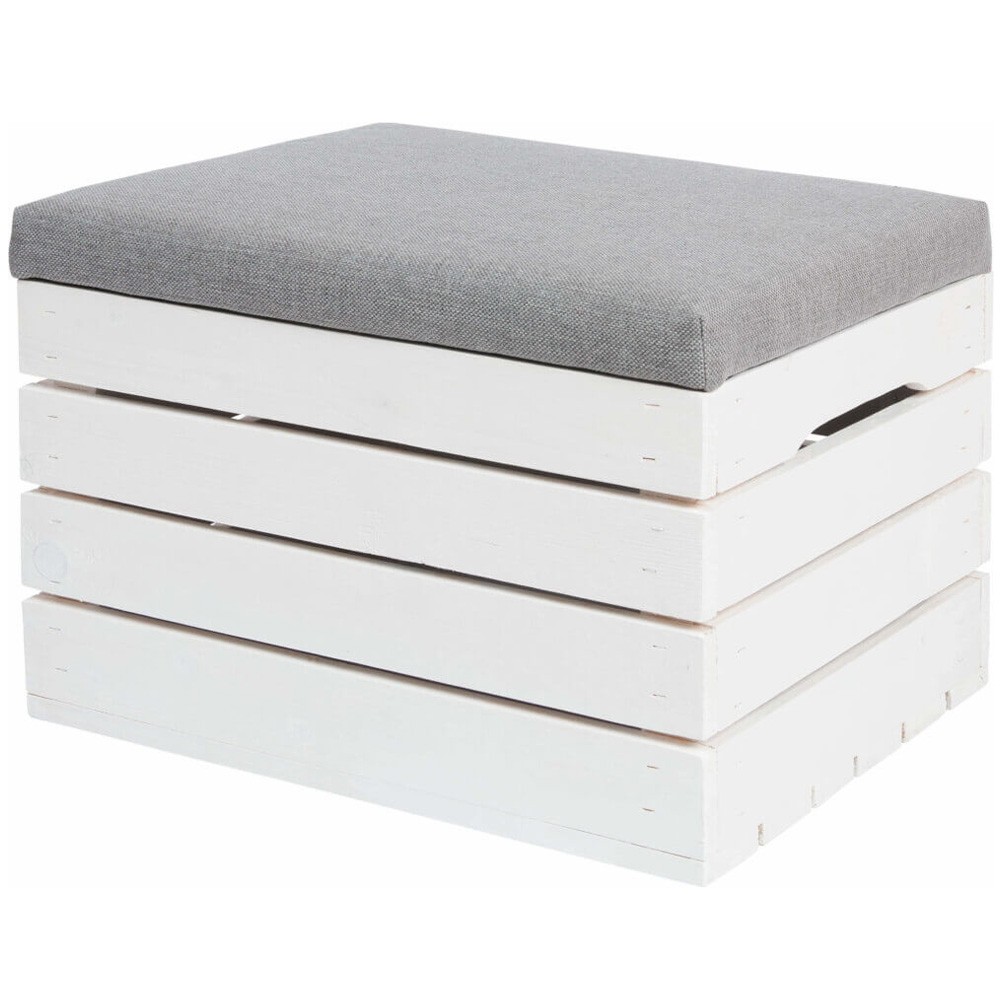 Le siège rembourré du coffre de rangement est confortable (mousse T-25 recouverte de tissu gris). Le coffre en bois séché et raboté (épicéa) est résistant. Il est peint avec une peinture acrylique et verni. Il pourra être placé sur un balcon. Le coffre de rangement repose sur des patins (feutres) pour éviter de rayer le sol lors de son déplacement.