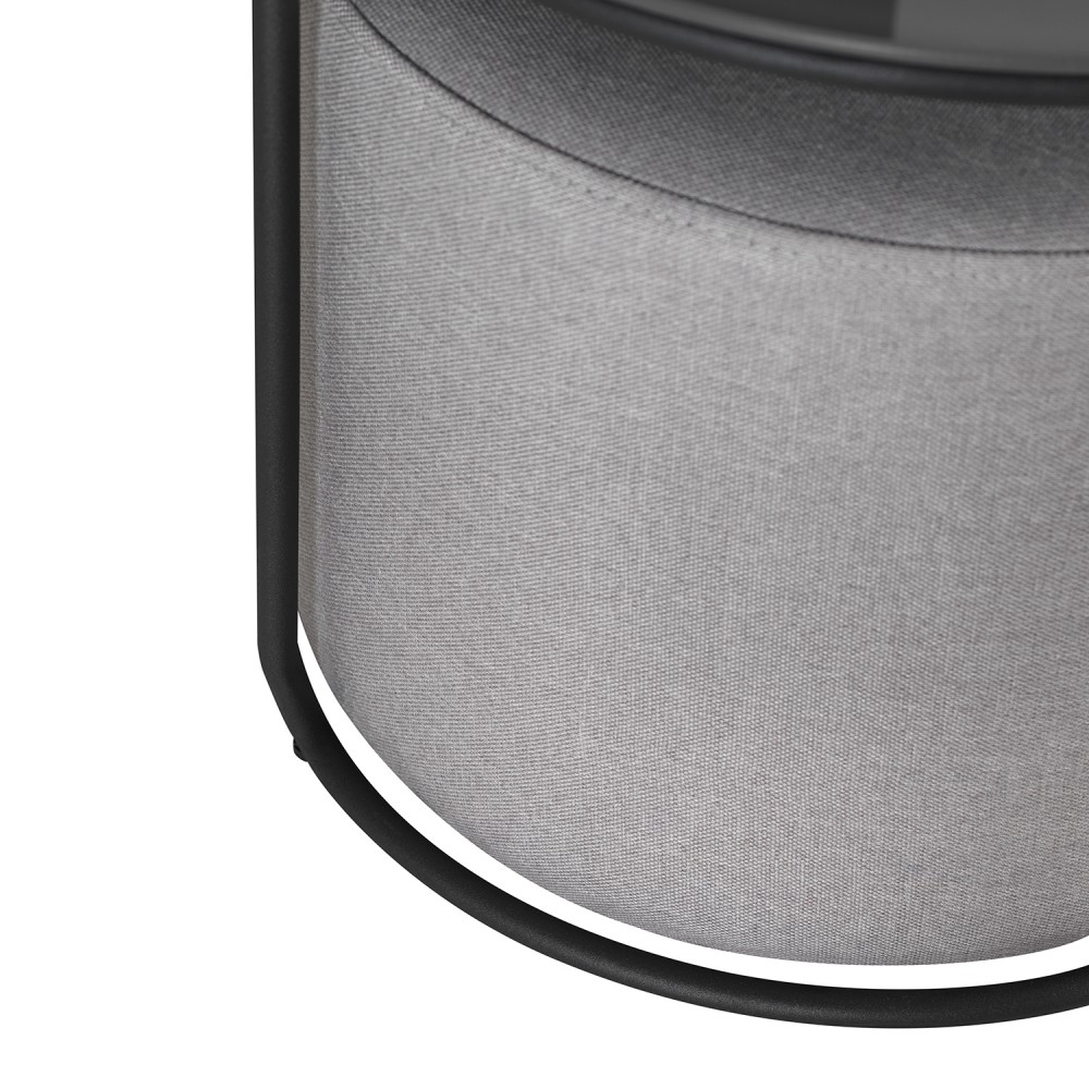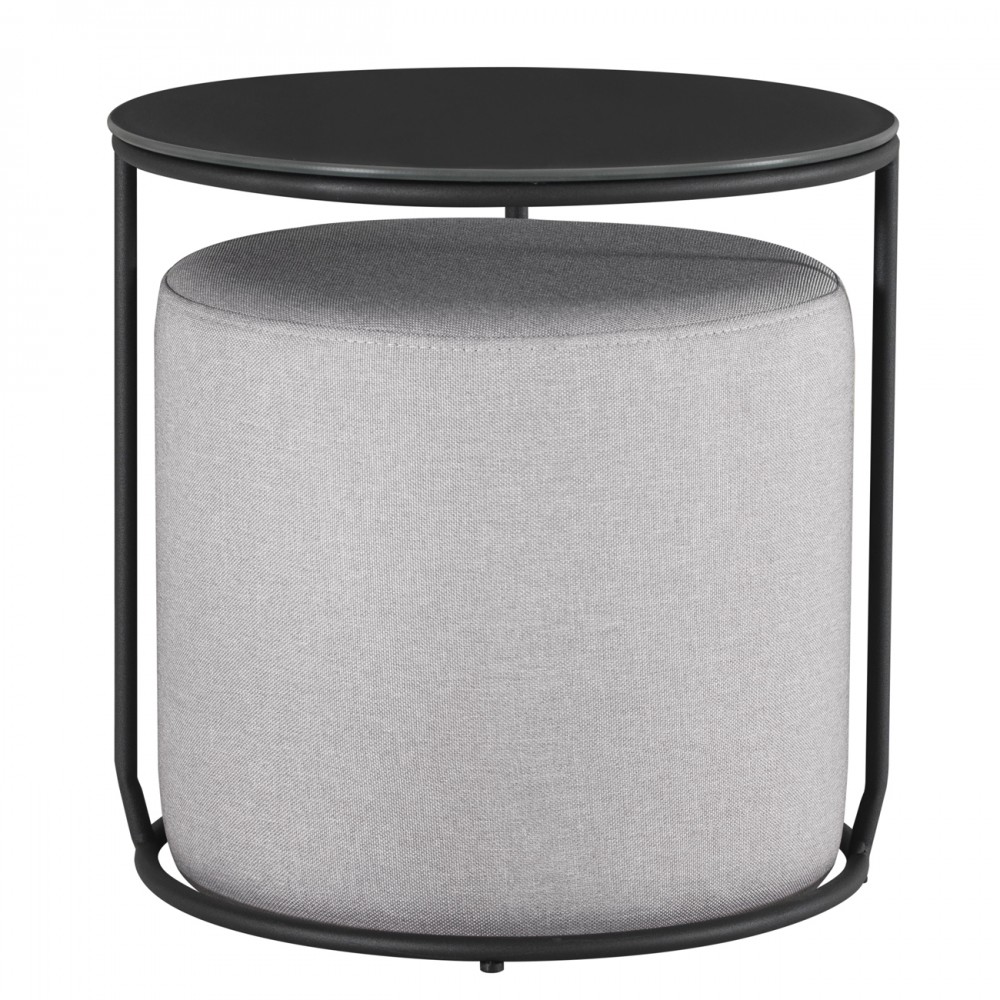 JASPER est un meuble 2 en 1 pratique et peu encombrant. La table dispose d'une structure noir en métal et d'un plateau en verre d'un diamètre de 40 cm. Le pouf gris en tissu se glisse facilement sous la petite table.