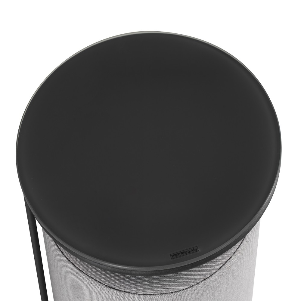 | bulletpointB | Table noire ronde avec structure en métal, plateau en verre et pouf gris en tissu. |