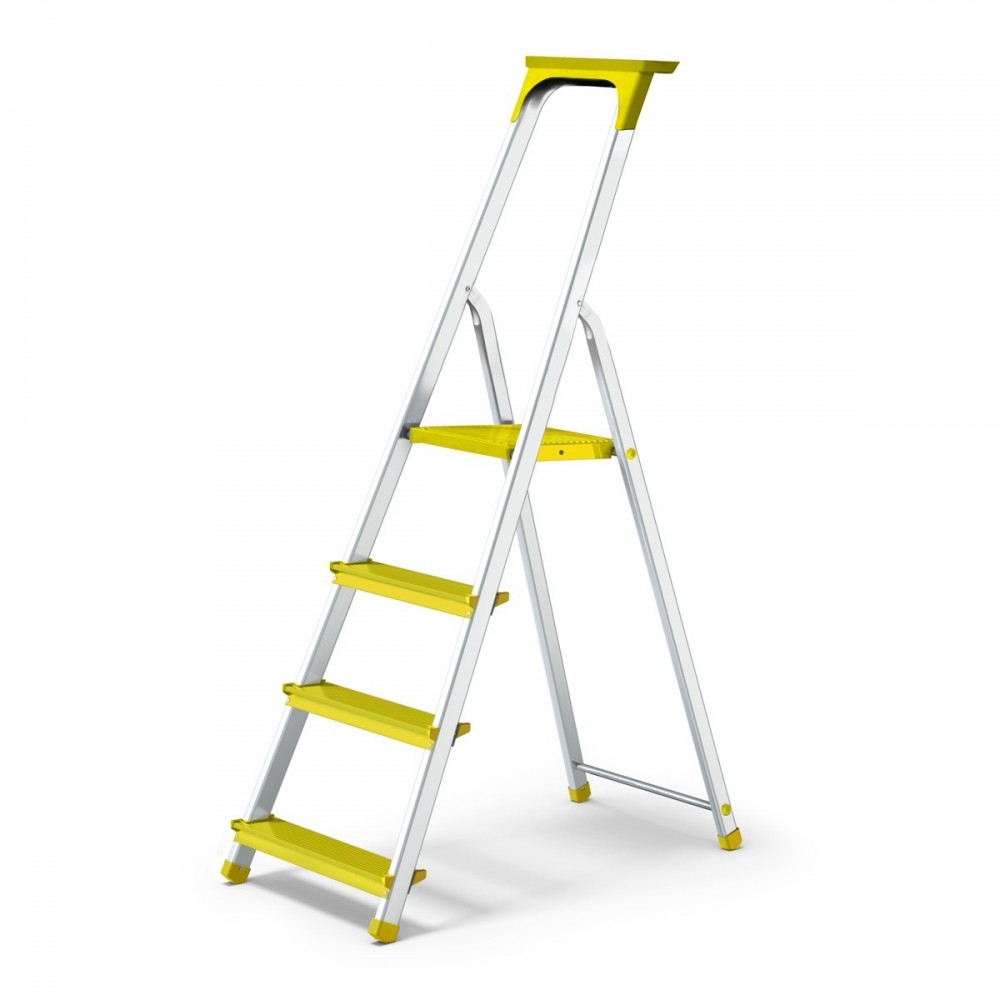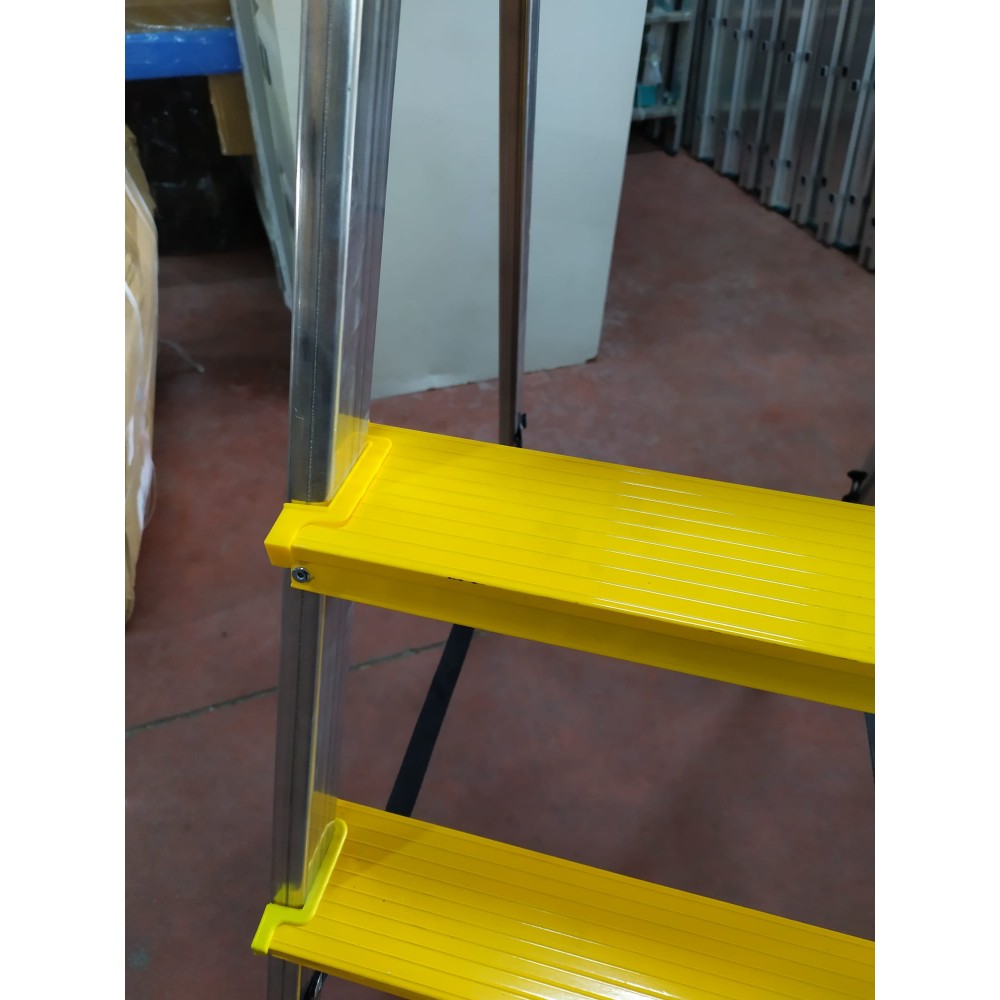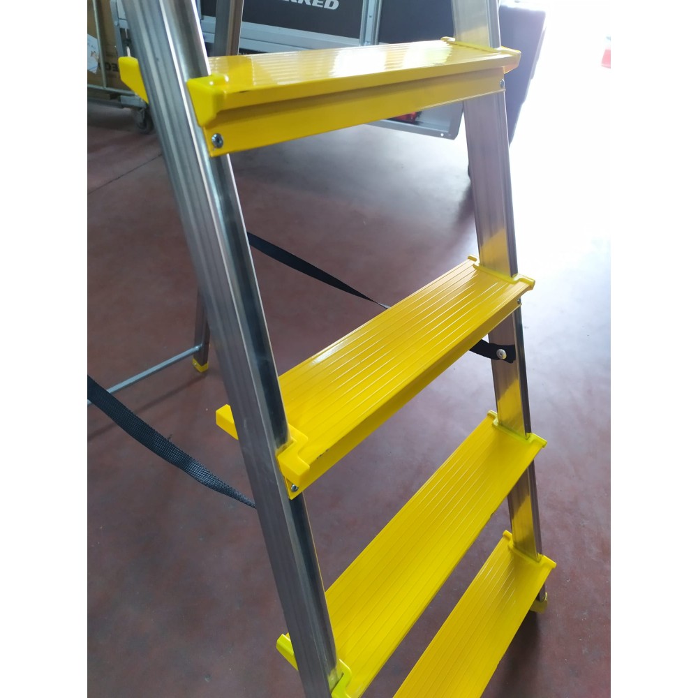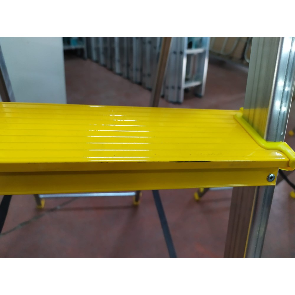 Escabeau en aluminium avec plateforme de travail et larges marches antidérapantes.