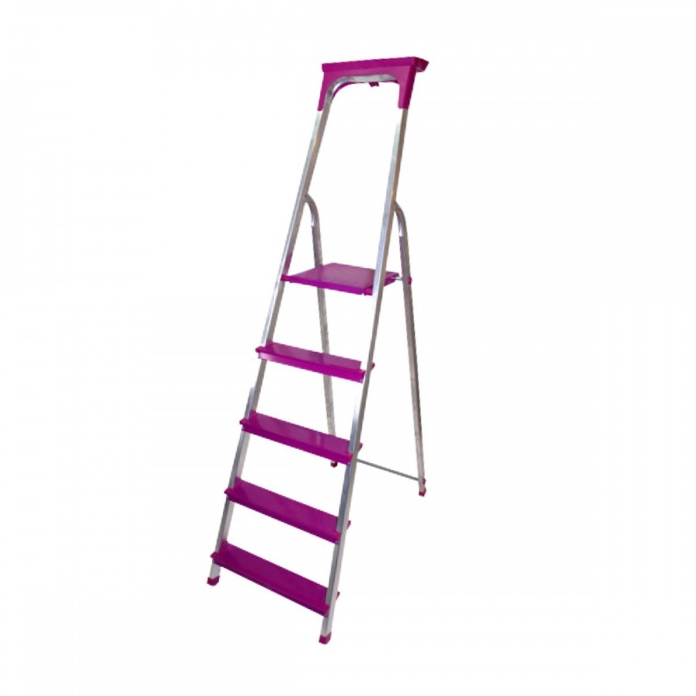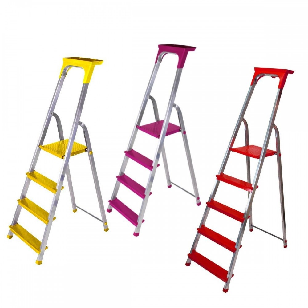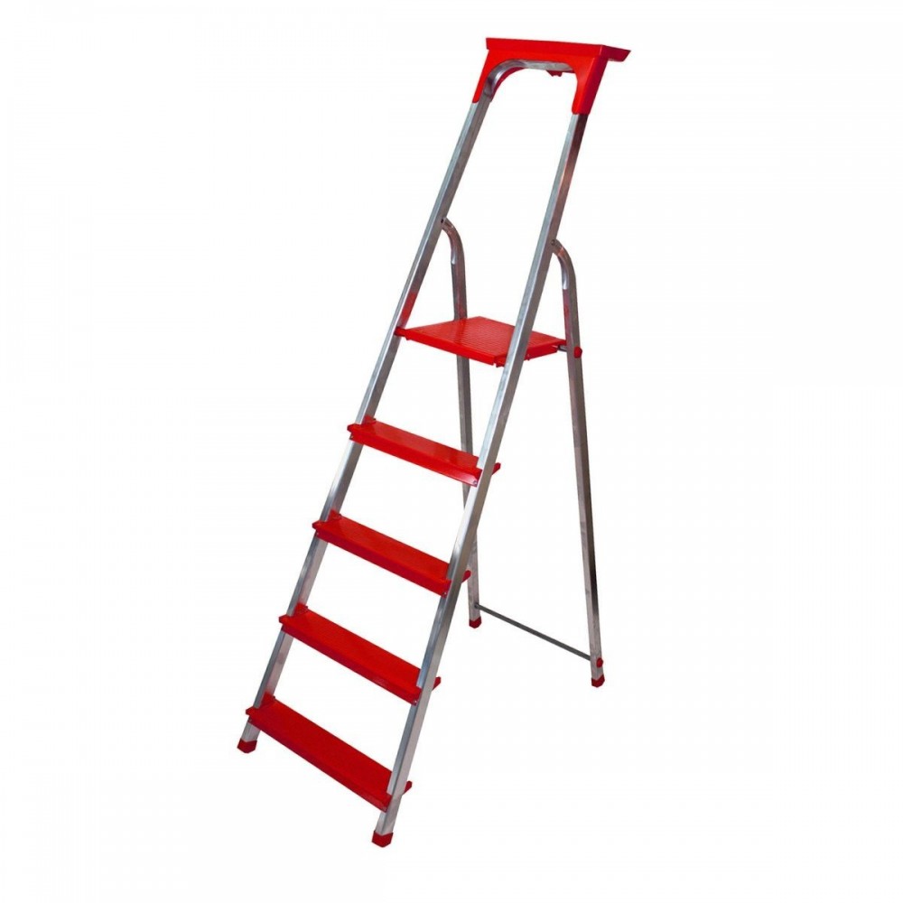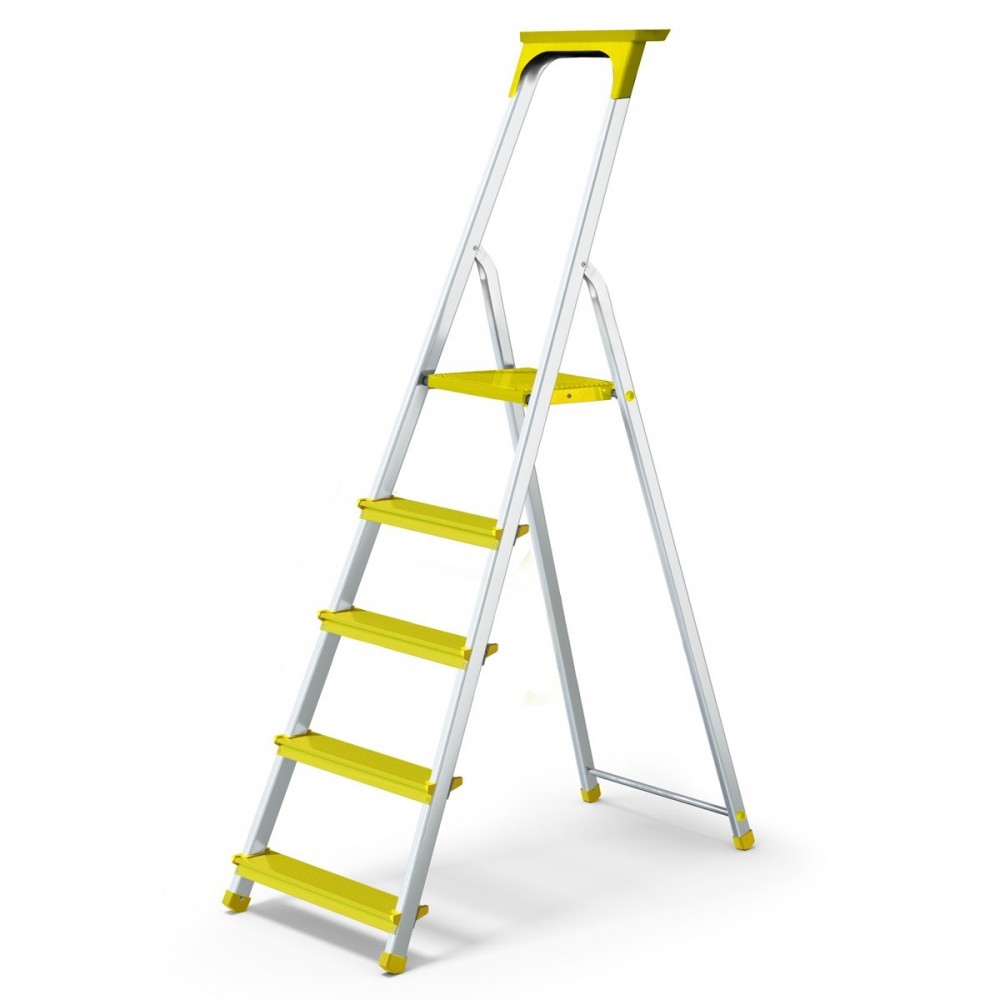 Escabeau en aluminium avec plateforme de travail et larges marches antidérapantes.