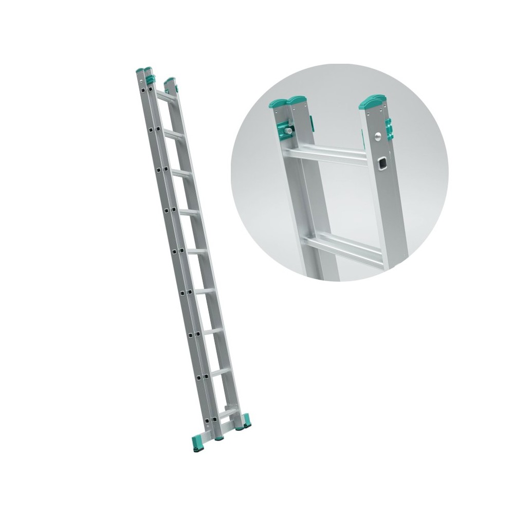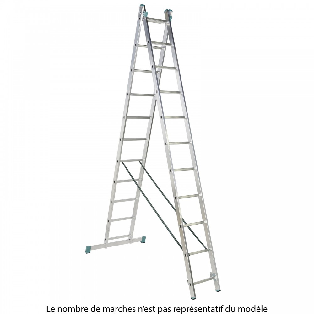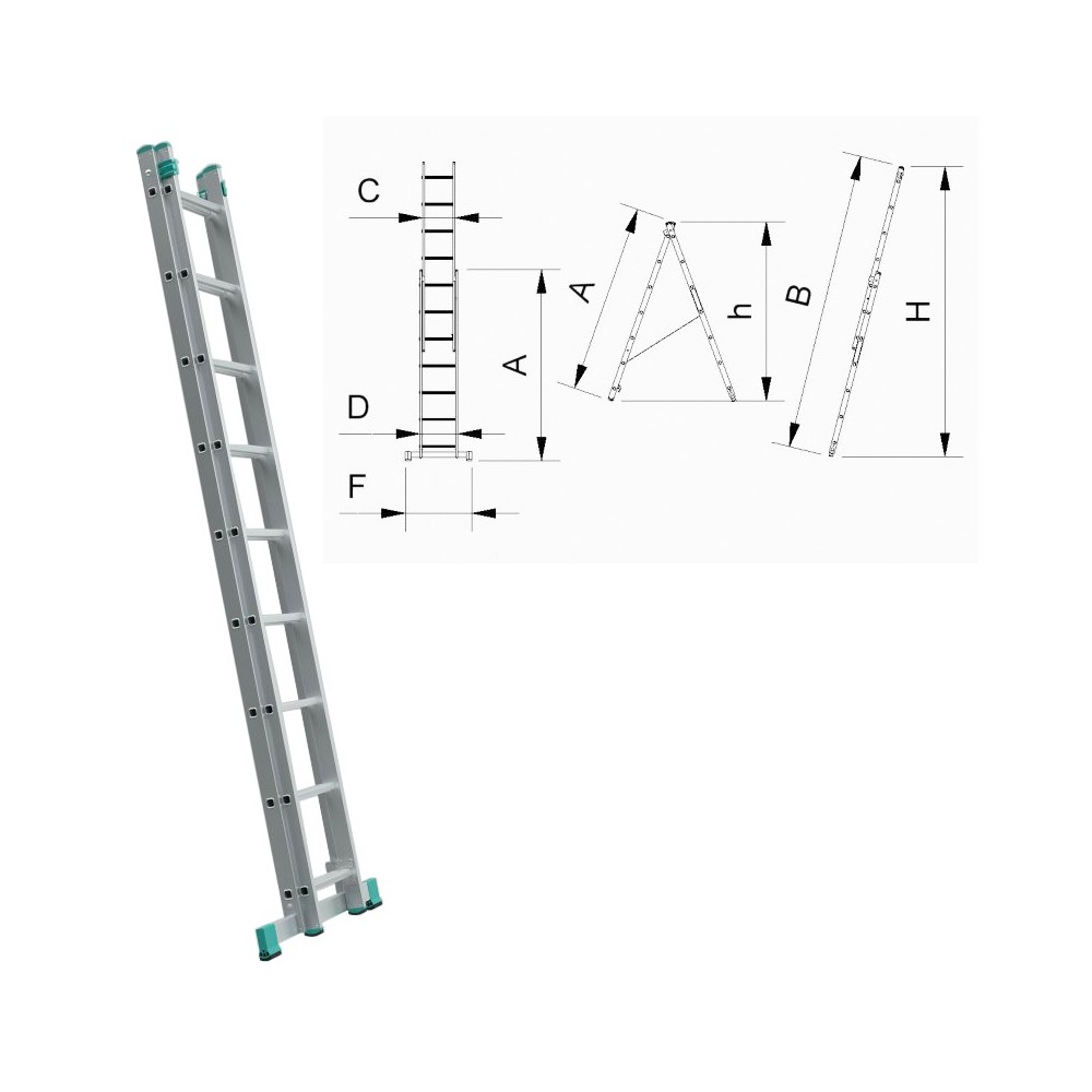 2 x 9 marches : A : 2,58 m / B : 4,28 m / C : 340 mm / D : 397 mm / H : 4,16 m (h: 2,44 m, F : 800 mm, poids 8,50 kg).