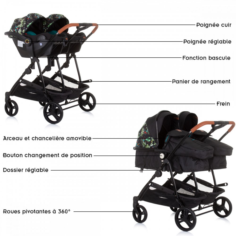 Cette poussette double et évolutive convient aux jumeaux et aux enfants d'âge rapproché.