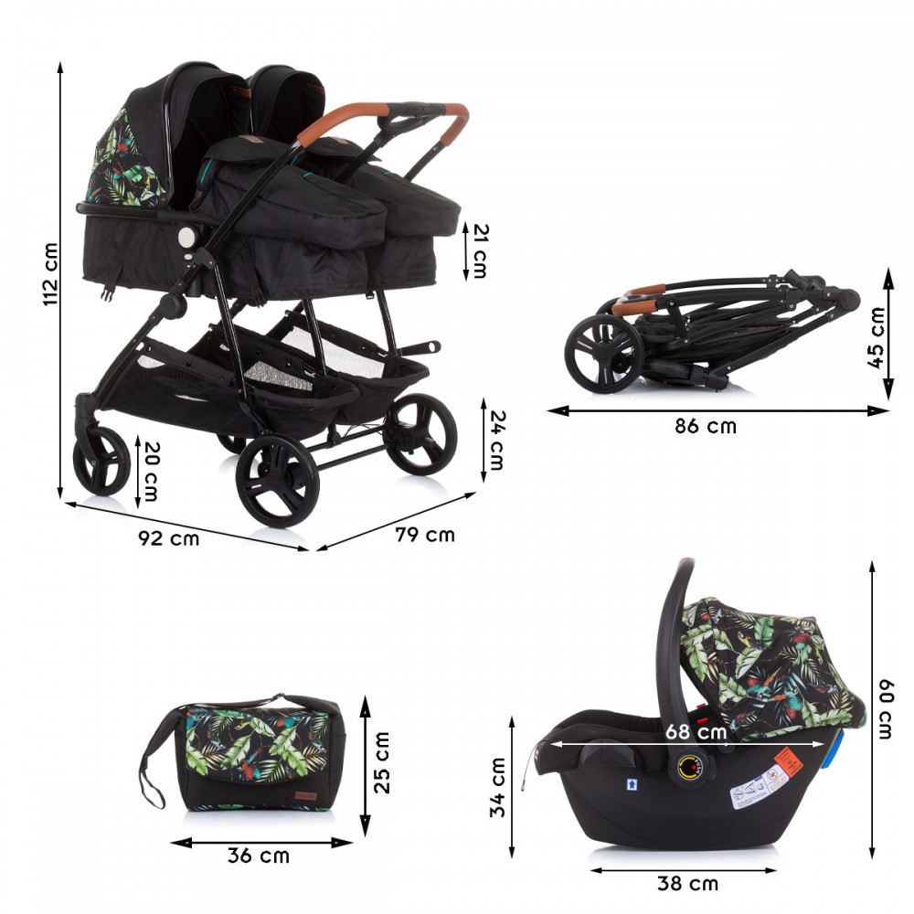 Poussette : L 92 cm x largeur poussette 79 cm x H 112 cm.