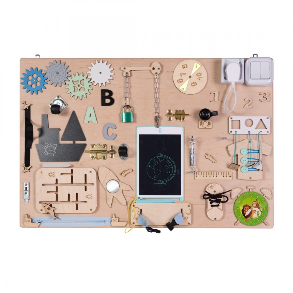 Loquets de verrouillage, fermeture éclair, scratch velcro, formes, lacets, roulettes, engrenages, interrupteur, prise à brancher, klaxon, miroir, labyrinthe avec forme, tableau avec craie, lettres, cadenas, boucle de sangle à clipser, pendules, chiffres, tablette magique avec stylet.
