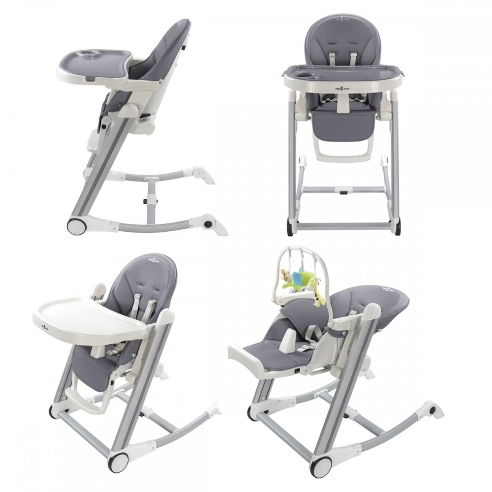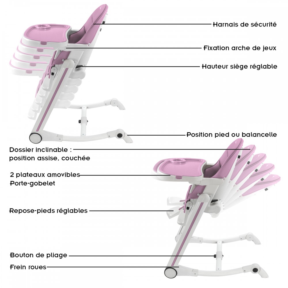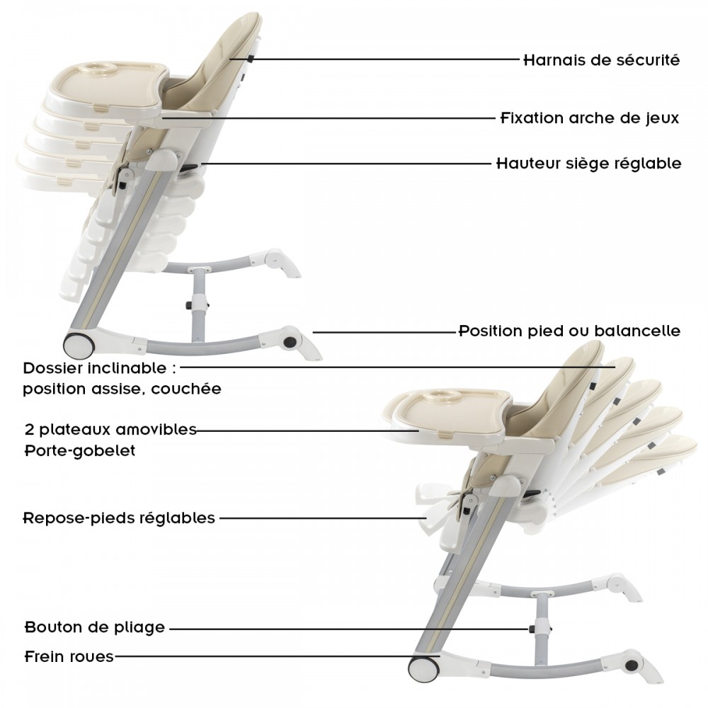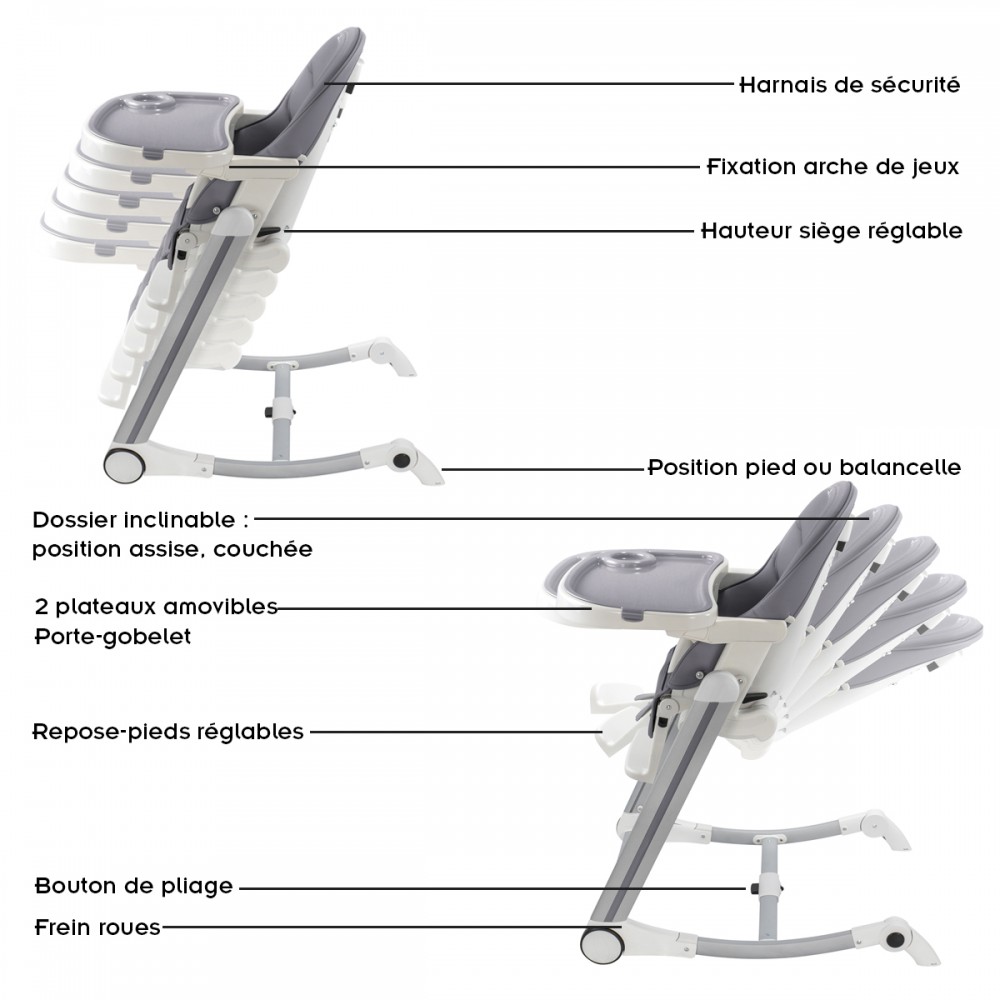 | bulletpointC | Arche de jeu incluant des peluches amovibles. Chaises haute dotée de 4 roues et d'un frein. Cette chaise dispose d'une fonction bascule. |