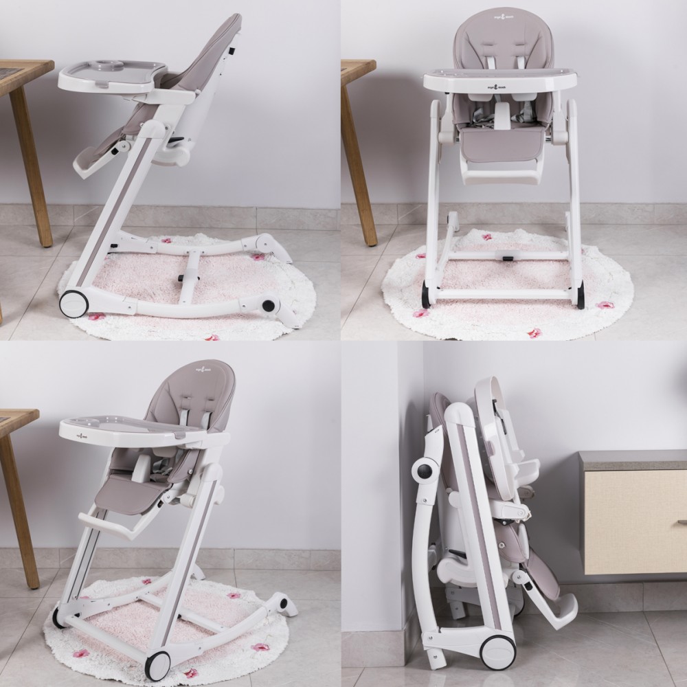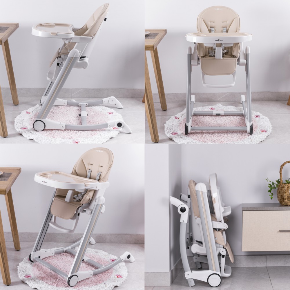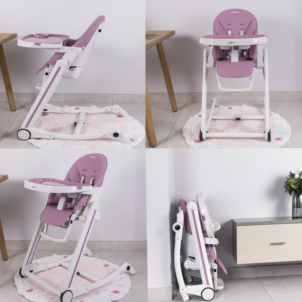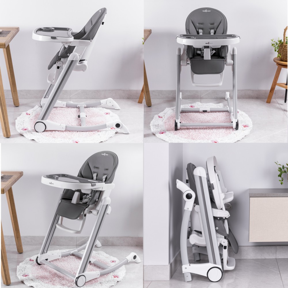 Cette chaise haute possède 4 roues et elle présente l'avantage de se plier pour un gain de place.