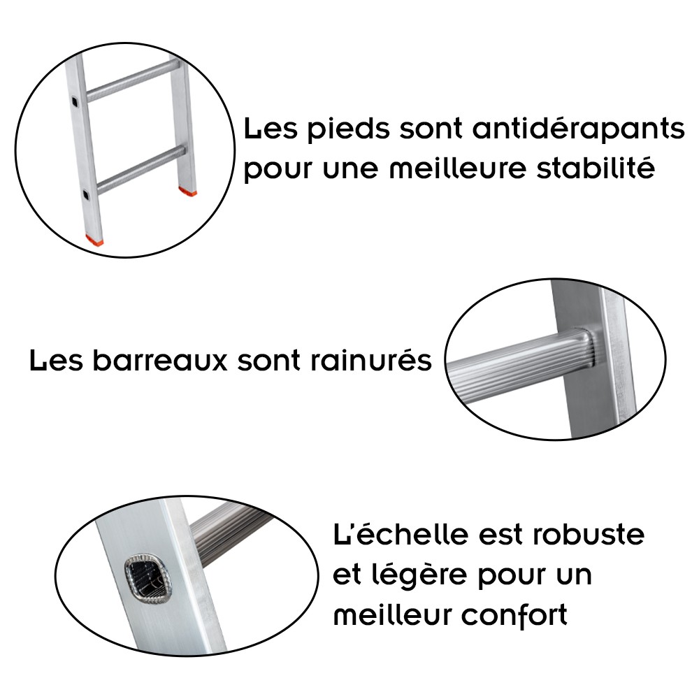 Les pieds de l'échelle et les barreaux rainurés sont antidérapants.