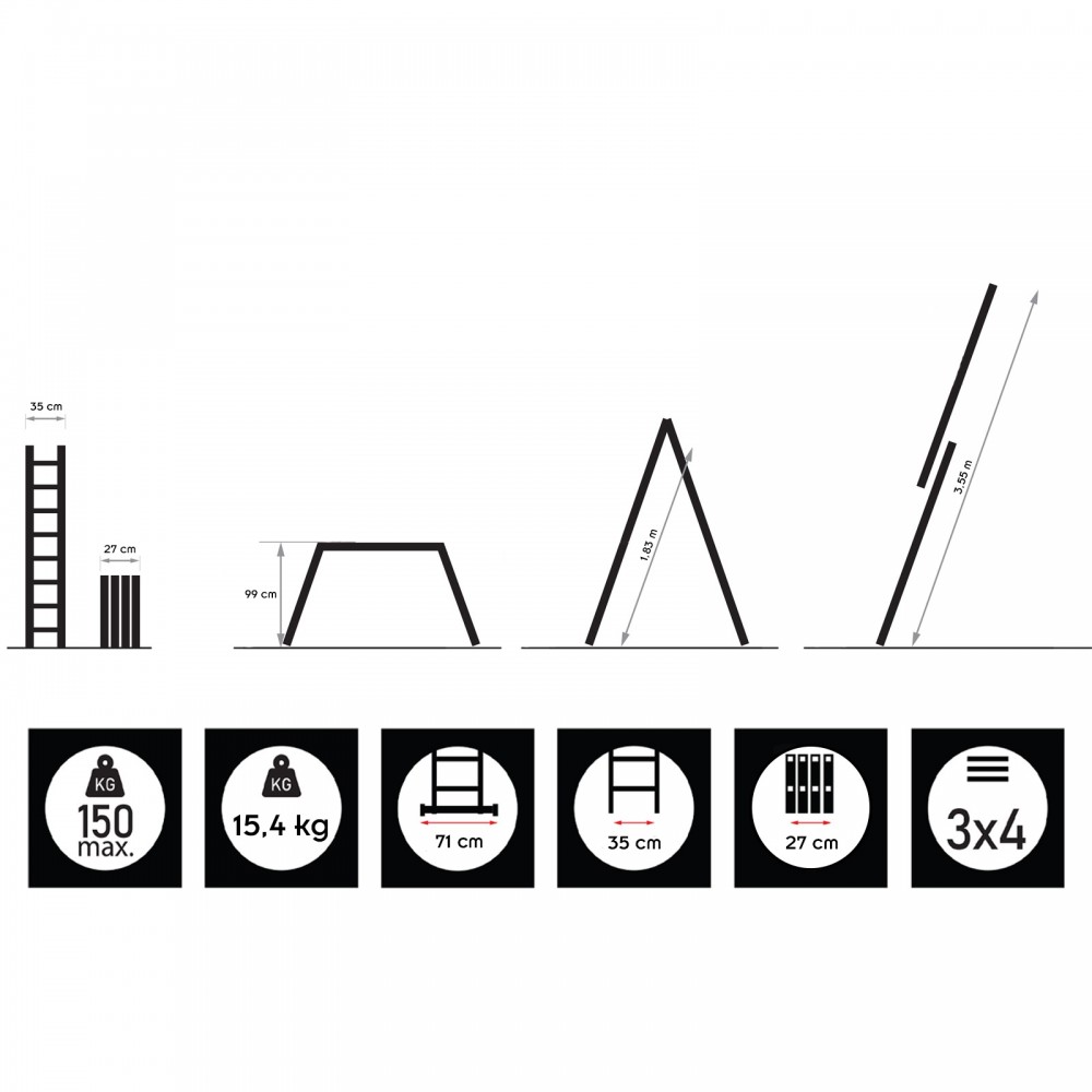 Dimensions dépliée (échelle 12 marches) : L 3,55 m x l 35 cm.