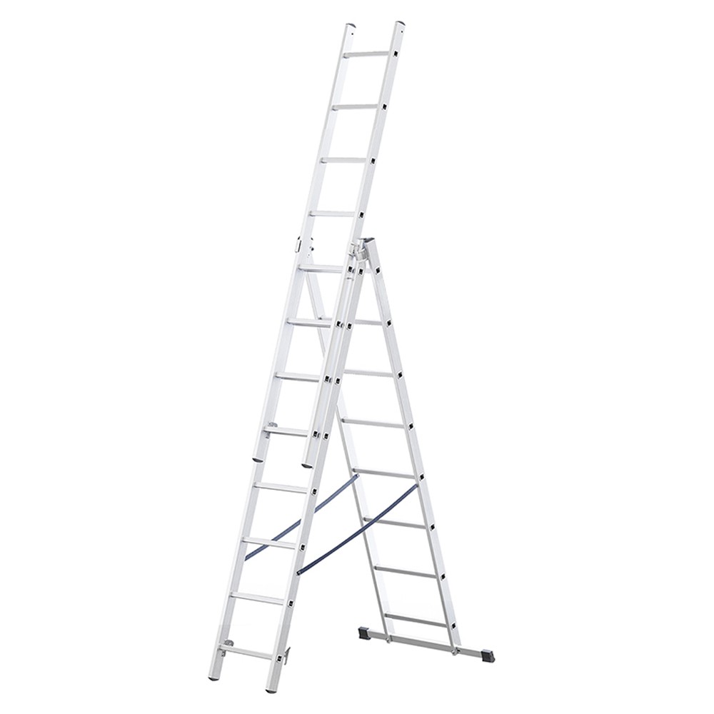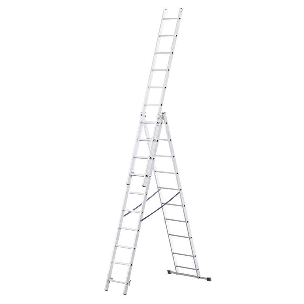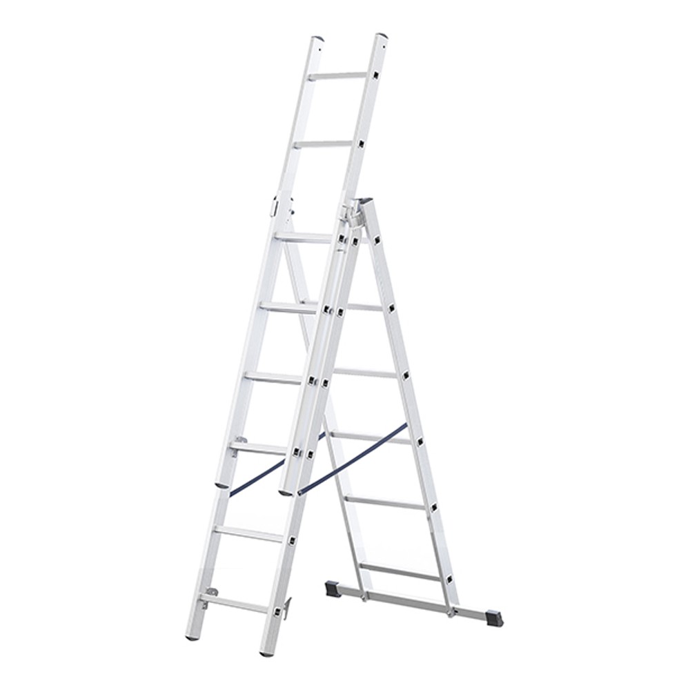 Echelle transformable en aluminium avec pieds renforcés et barreaux antidérapants. Des crochets en acier galvanisé avec verrou automatique maintiennent l'échelle dépliée.