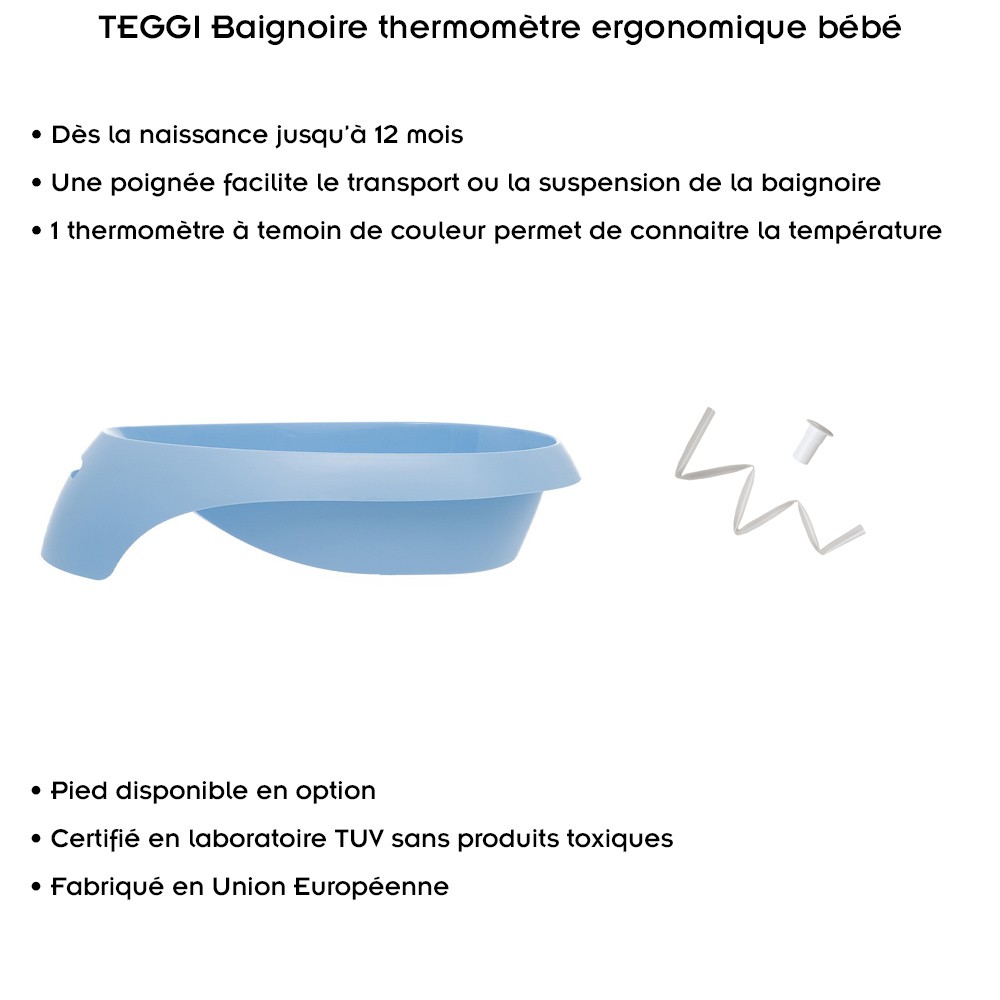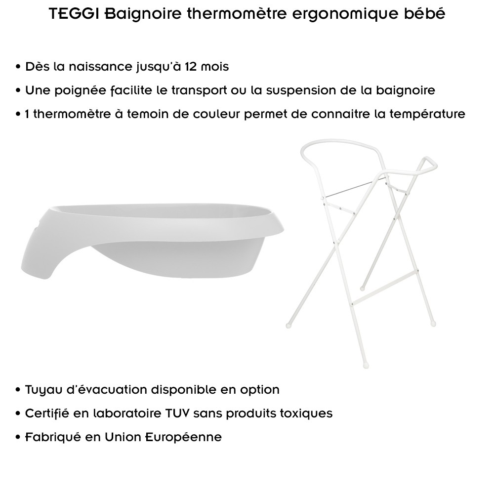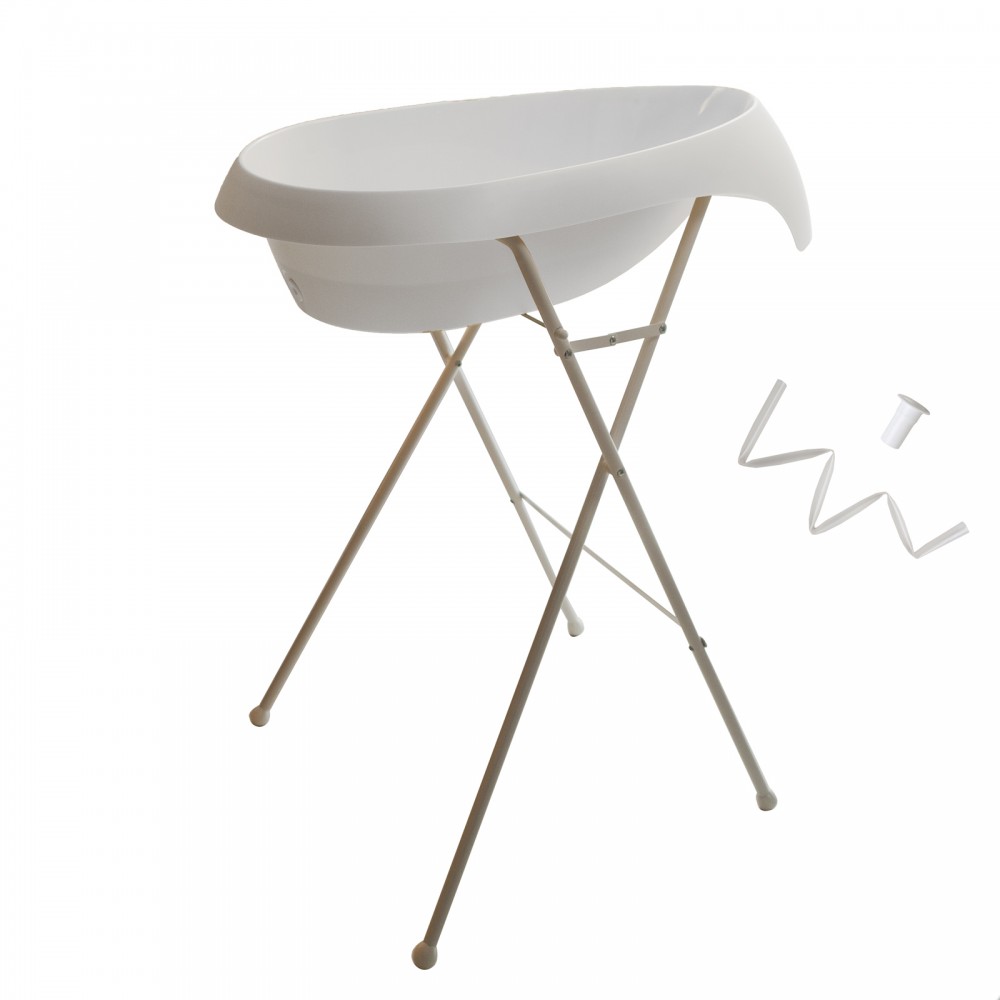 Les pieds (en option) permettent la baignade du bébé à hauteur de bras, ce qui permet d'avoir une position ergonomique et confortable lors de la toilette de votre enfant. Le tuyau d'évacuation de 70 cm (en option) permet de vidanger la baignoire dans votre lavabo/douche/baignoire sans porter un volume d'eau conséquent.