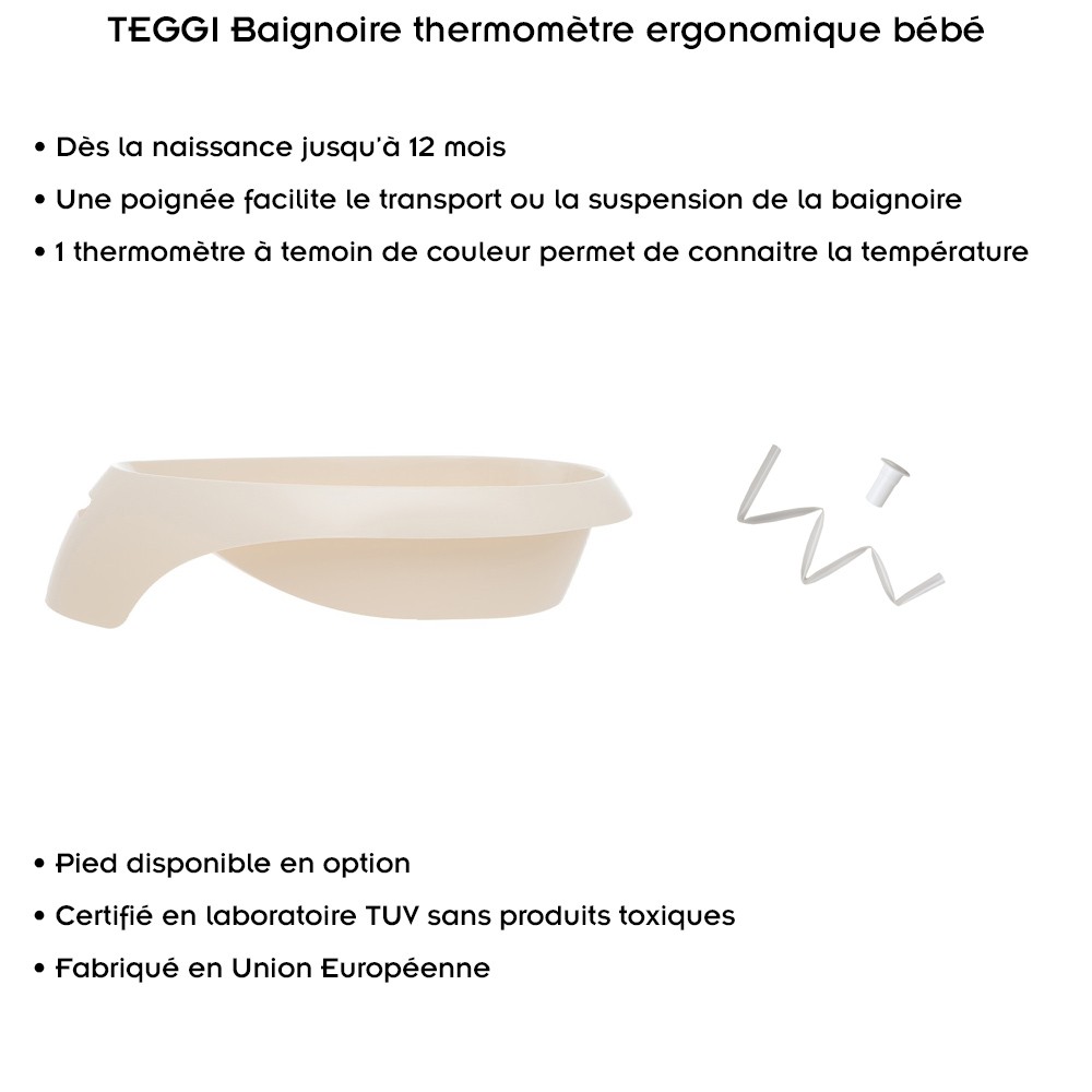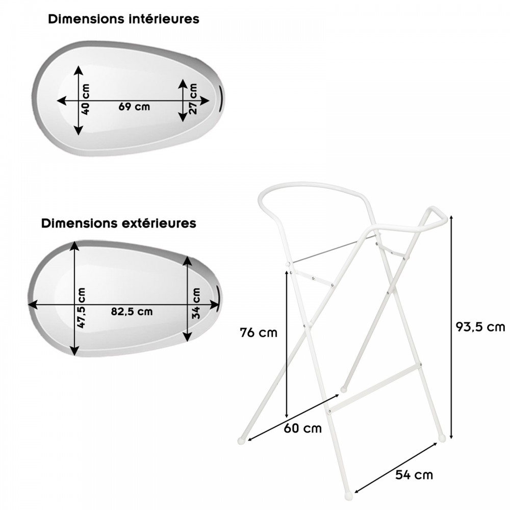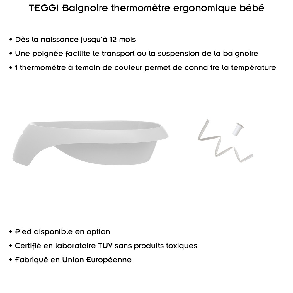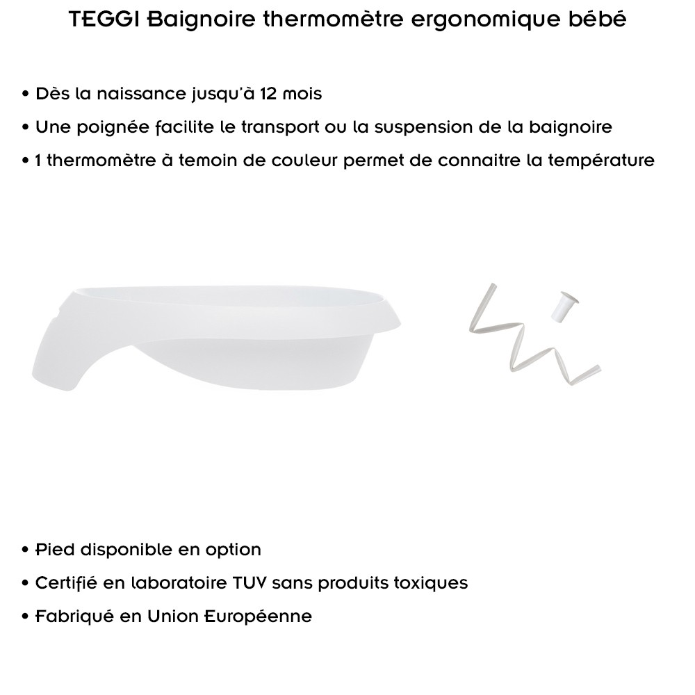 Les pieds (en option) permettent la baignade du bébé à hauteur de bras, ce qui permet d'avoir une position ergonomique et confortable lors de la toilette de votre enfant. Le tuyau d'évacuation de 70 cm (en option) permet de vidanger la baignoire dans votre lavabo/douche/baignoire sans porter un volume d'eau conséquent.