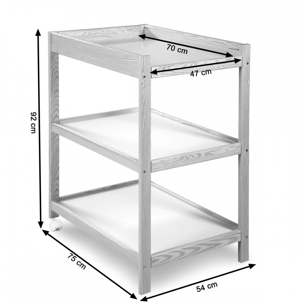 Dimensions de la table à langer : H. 92 X L. 54 X P. 75 cm.