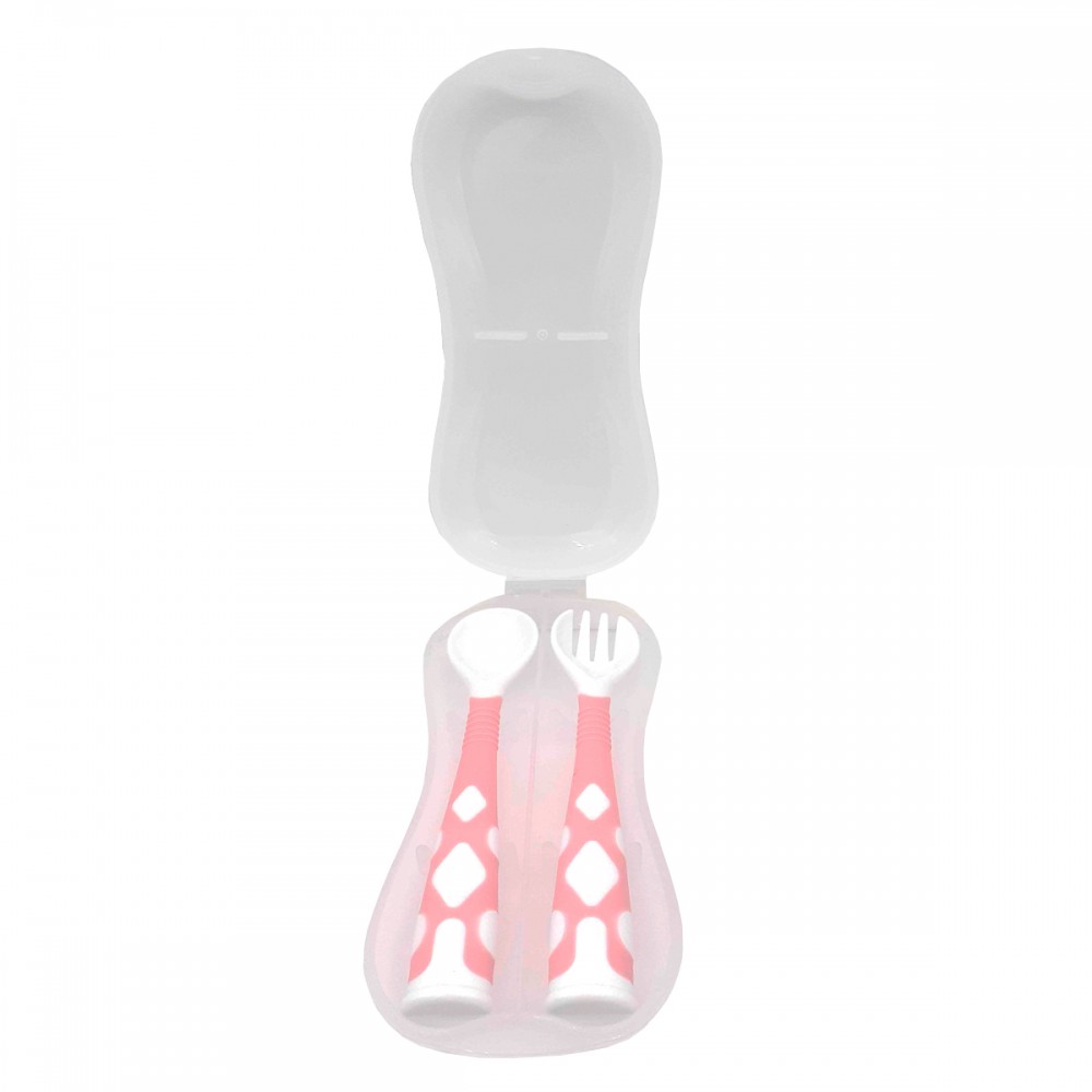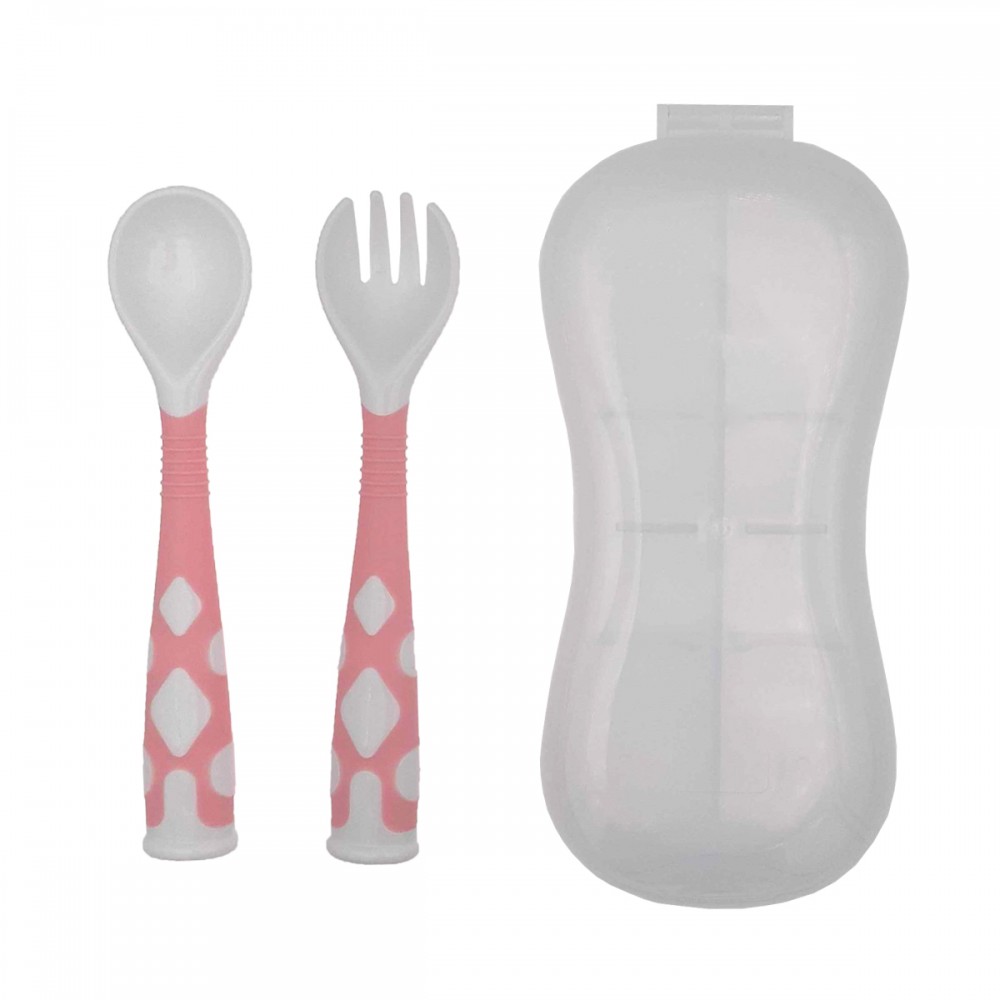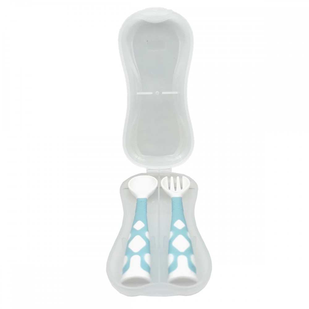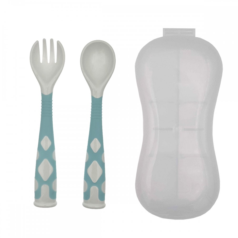 | bulletpointD | 1 fourchette et 1 petite cuillère en silicone dur avec manches flexibles dans une boîte de rangement. |
