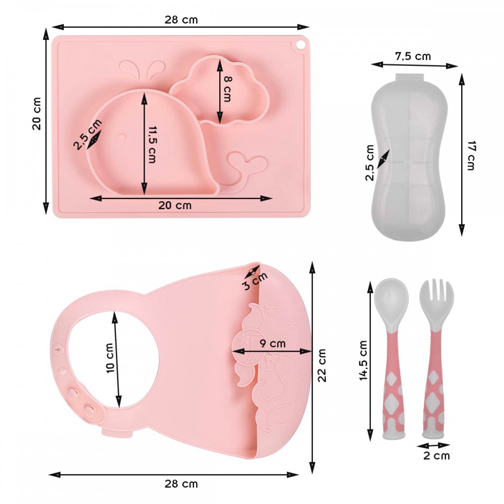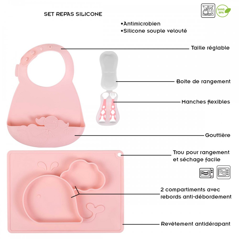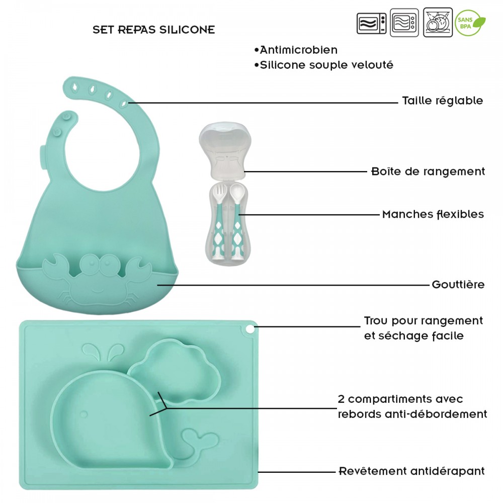| bulletpointA | Ensemble set de repas pour bébé dès 6 mois en silicone souple. Existe en plusieurs coloris. |