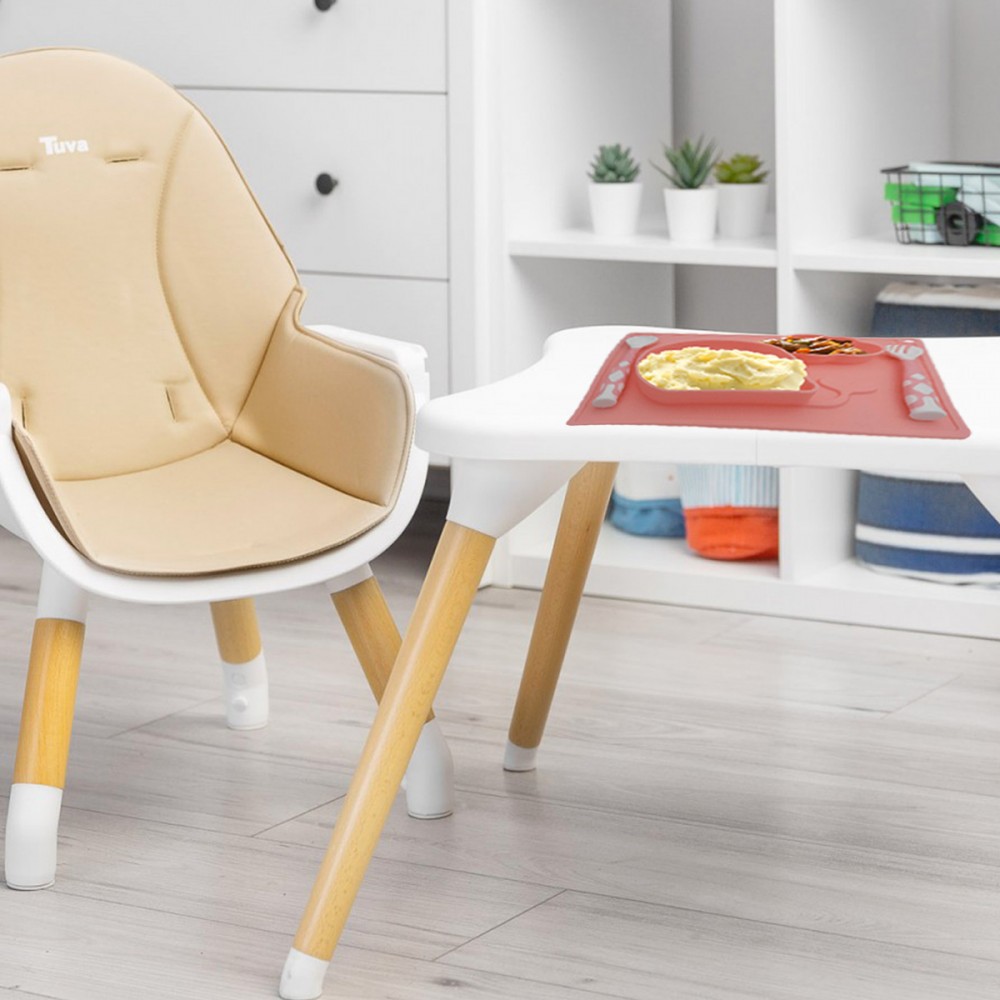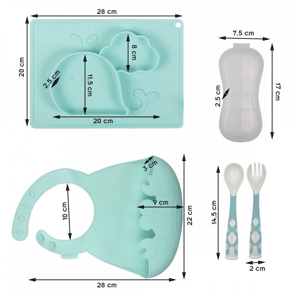 L’assiette dispose d’un trou dans un angle afin de la suspendre pour le rangement ou le séchage. Le bavoir, réglable, dispose d’une gouttière pour plus de propreté. Les couverts, une cuillère et une fourchette, sont en silicone dur avec un manche souple et flexible pour s’adapter à la bouche et à la main de l’enfant. Lorsqu’ils ne sont pas utilisés, ils se rangent dans une boîte hermétique.
