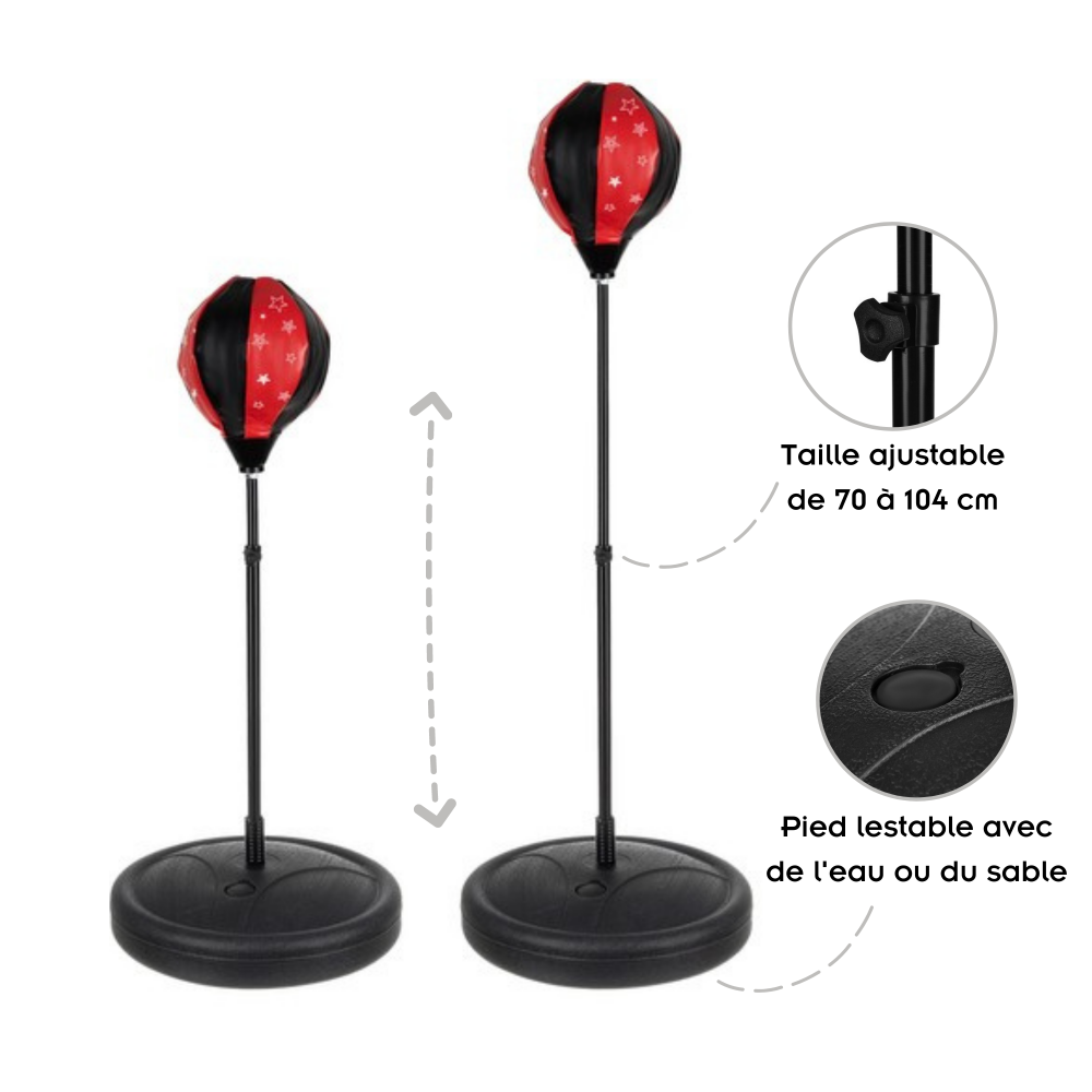 Ce punching ball est solide et son pied est lestable. Il est aussi réglable en hauteur, entre 70 et 104 cm. Vous pouvez ajuster le gonflage, et donc la dureté de la zone de frappe, pour vous adapter à l'âge et aux capacités de votre enfant.