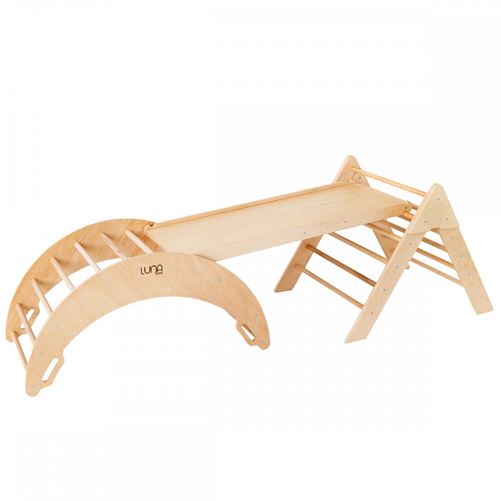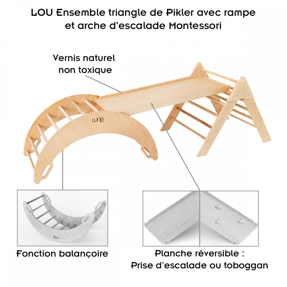 | bulletpointA | Ensemble de jouets en bois Montessori pour enfants : triangle de Pikler, arche d'escalade et rampe de glisse. |