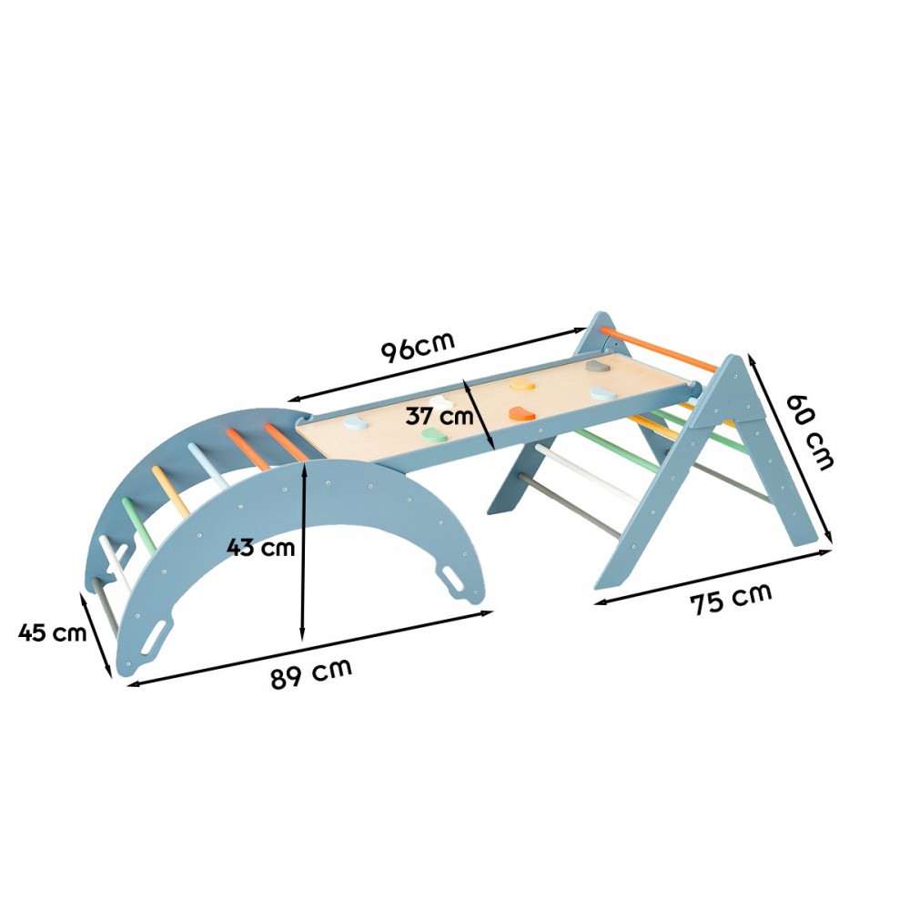Il est composé de 3 éléments : 1 triangle de Pikler, 1 rampe et 1 arche d'escalade. Assemblés, ces 3 éléments permettent à vos enfants de glisser, grimper, escalader, développer leur motricité et leur imagination.
