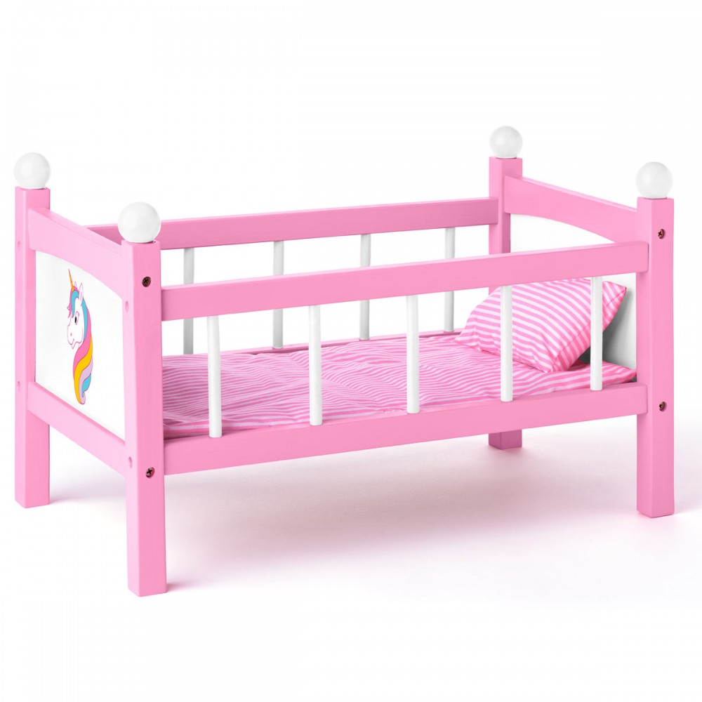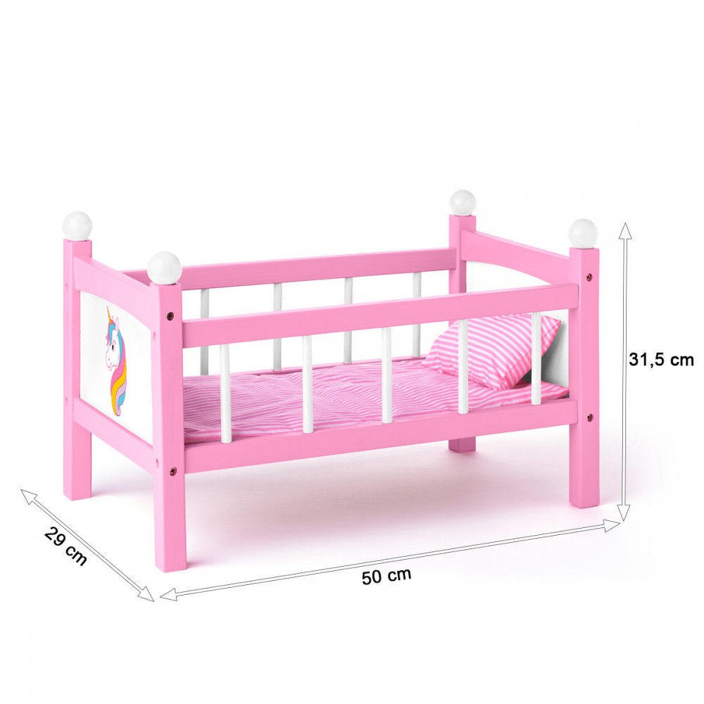 Ce jouet en bois, lit à barreaux pour poupon contient la couverture et l'oreiller. Un tête de licorne colorée est imprimée sur le pied de lit.