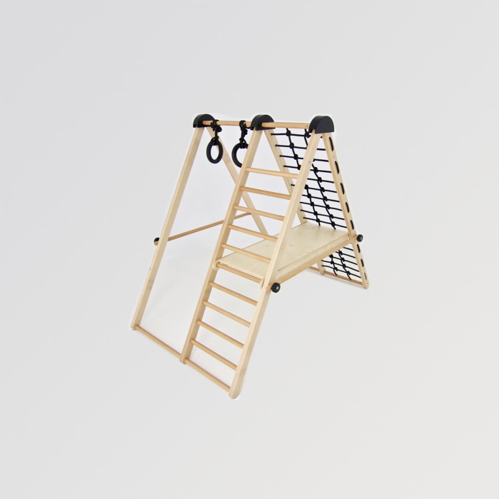 | bulletpointB | Jeu en bois, durabilité et écologie garanties. Utilisable en forme triangulaire posé au sol ou accroché au mur. |