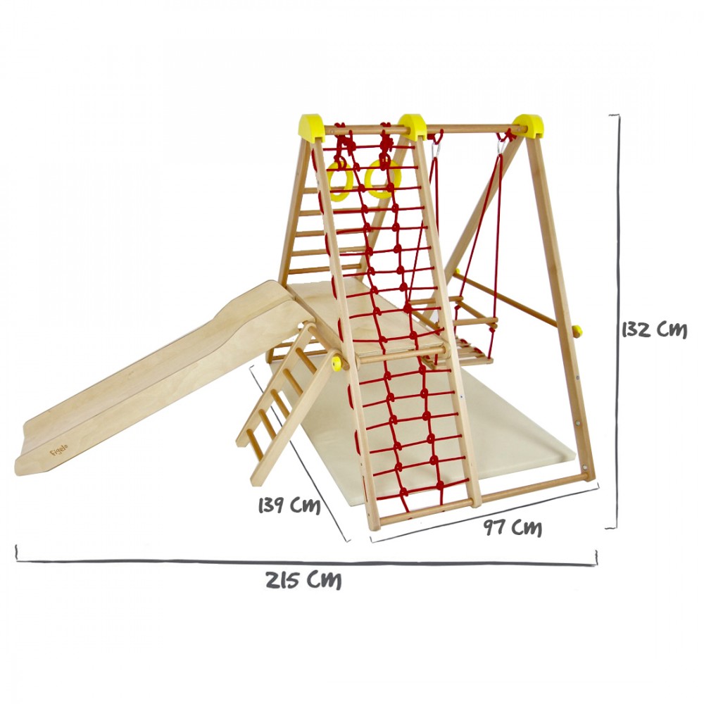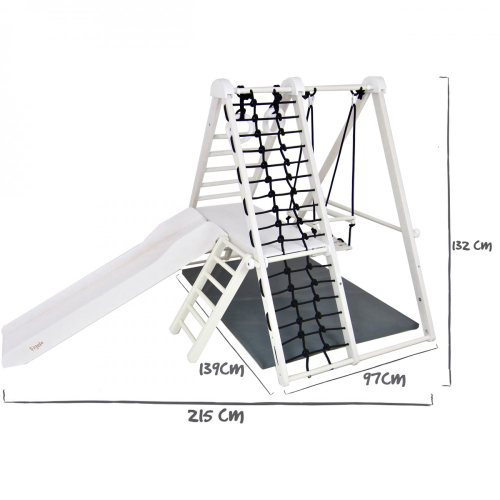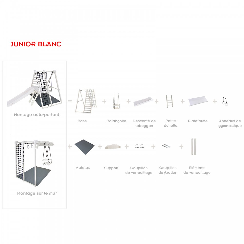 | bulletpointC | L'ensemble est composé d'1 base, 1 balançoire, 1 plateforme, 1 petite échelle, 1 grande échelle et 1 filet en corde. |