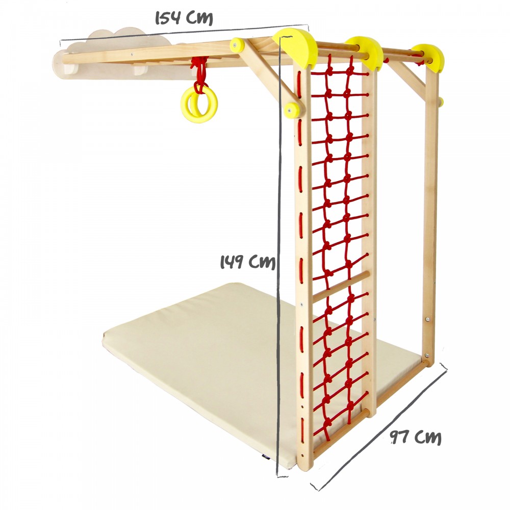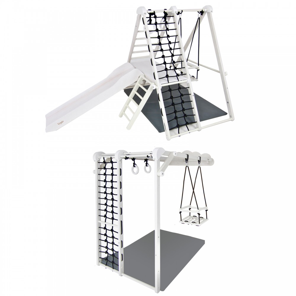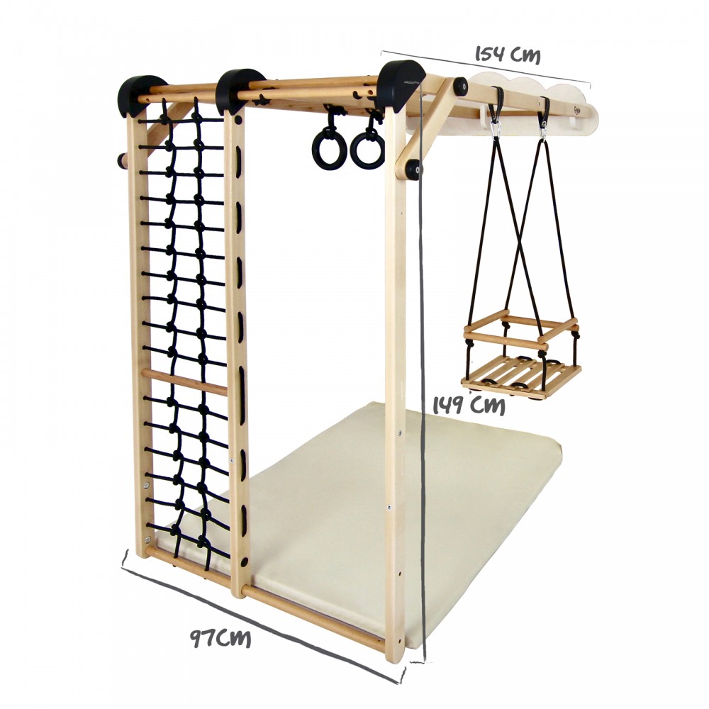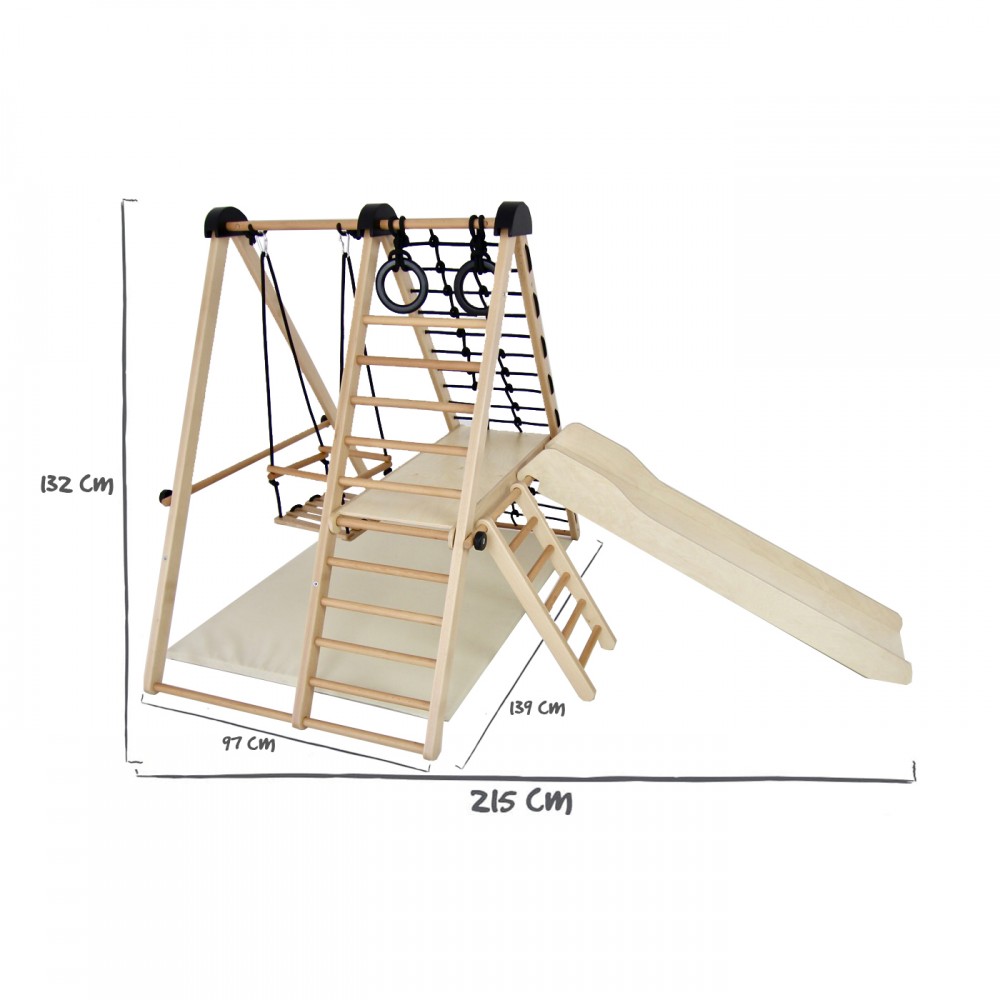 | bulletpointC | L'ensemble est composé d'1 base, 1 balançoire, 1 plateforme, 1 petite échelle, 1 grande échelle et 1 filet en corde. |