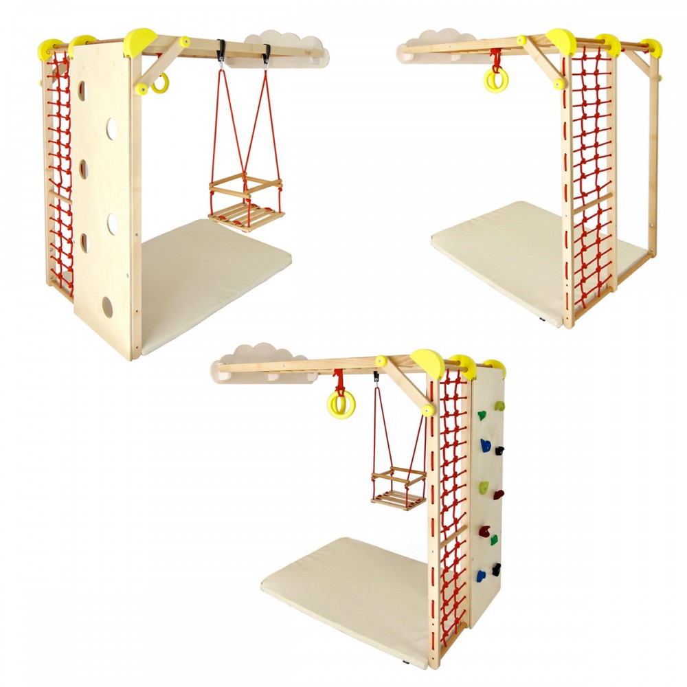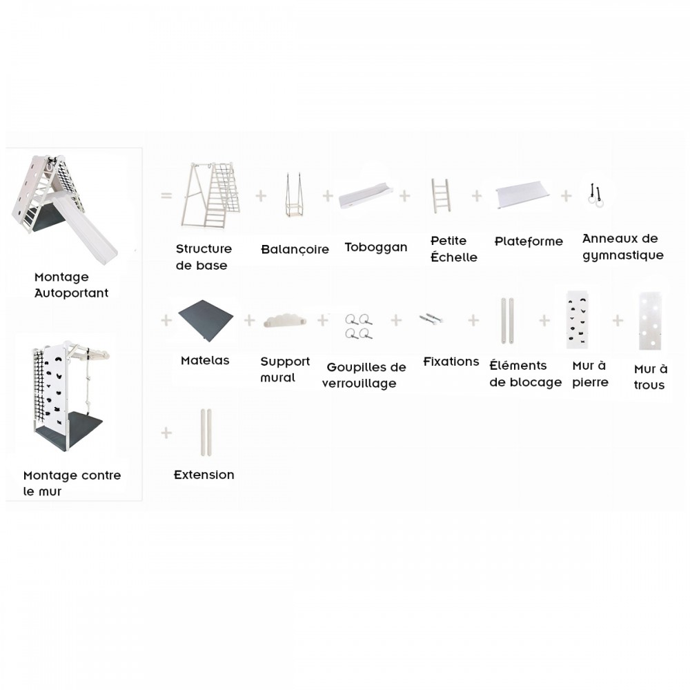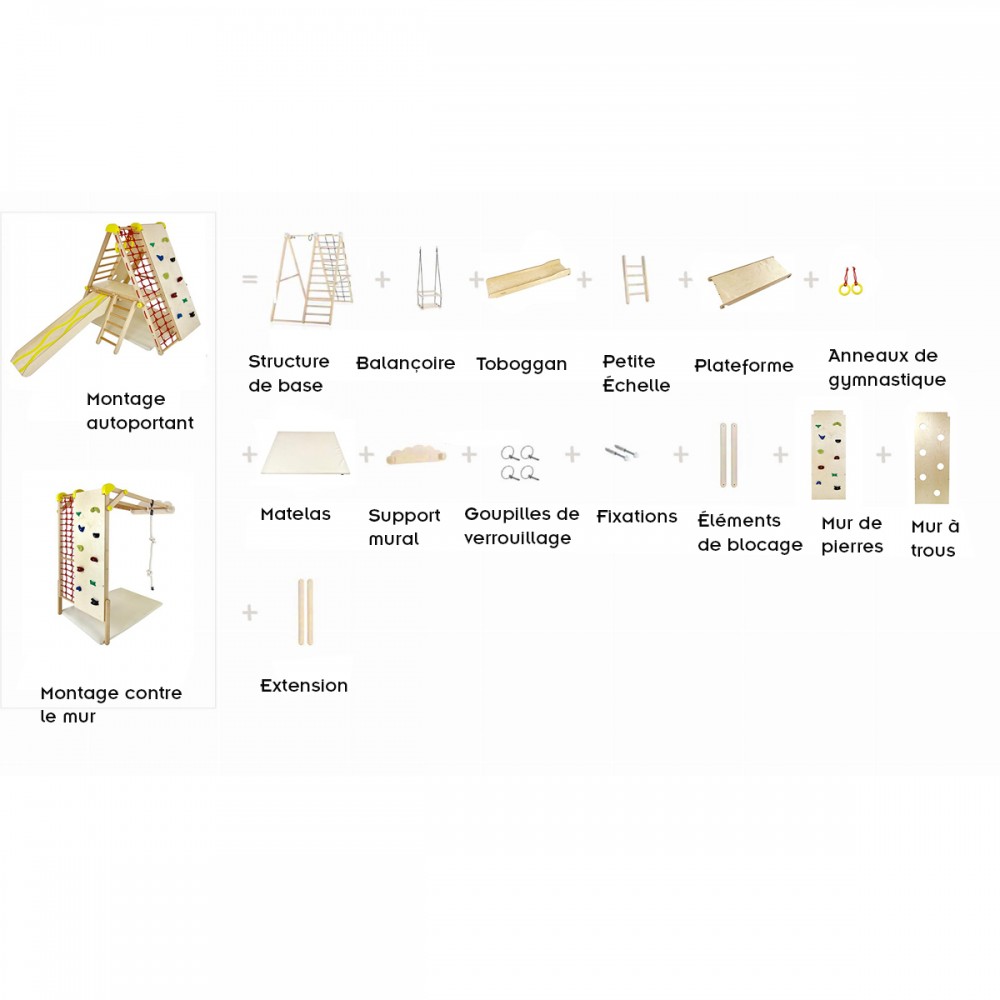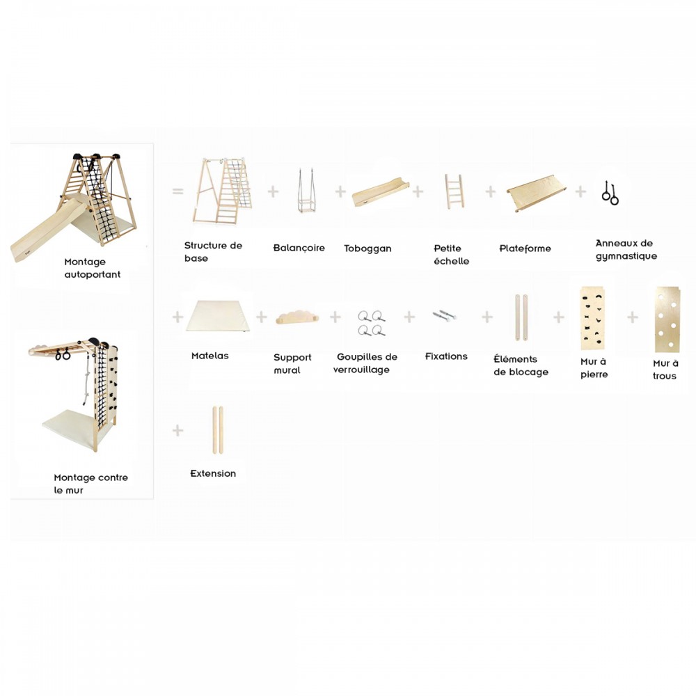 | bulletpointA | Terrain de jeux d'intérieur pour les enfants dès 6 mois. Modulable, il fait portique ou peut être fixé au mur. |