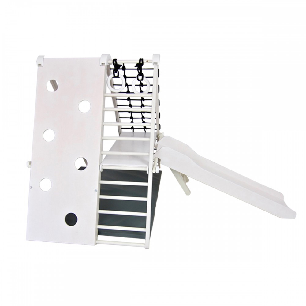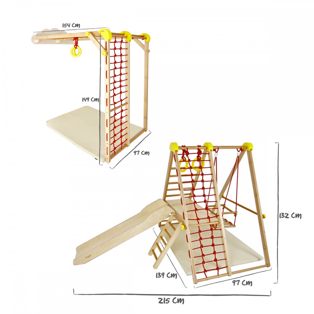 | bulletpointC | Toboggan avec piste pour petites voitures sur son verso. 2 anneaux de gymnastique et tapis de sol pour la sécurité. |