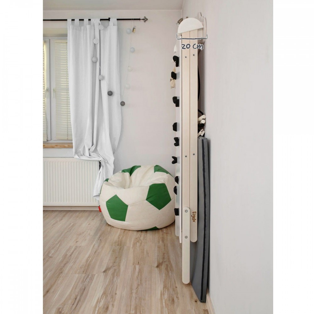 Simple à monter et à moduler, la structure est facile à plier et se range à la verticale à l’aide de son support mural. Des extensions permettent d’agrandir la structure (25 cm supplémentaires en hauteur). Les enfants peuvent ainsi profiter du complexe jusqu’à 12 ans.