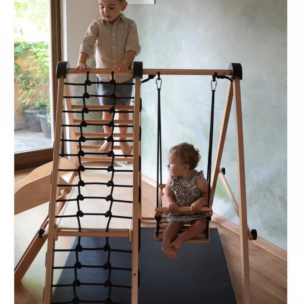 Les plus grands pourront balancer les plus jeunes ou leur faire dévaler le toboggan. Un tapis permet aux enfants de jouer en toute sécurité.