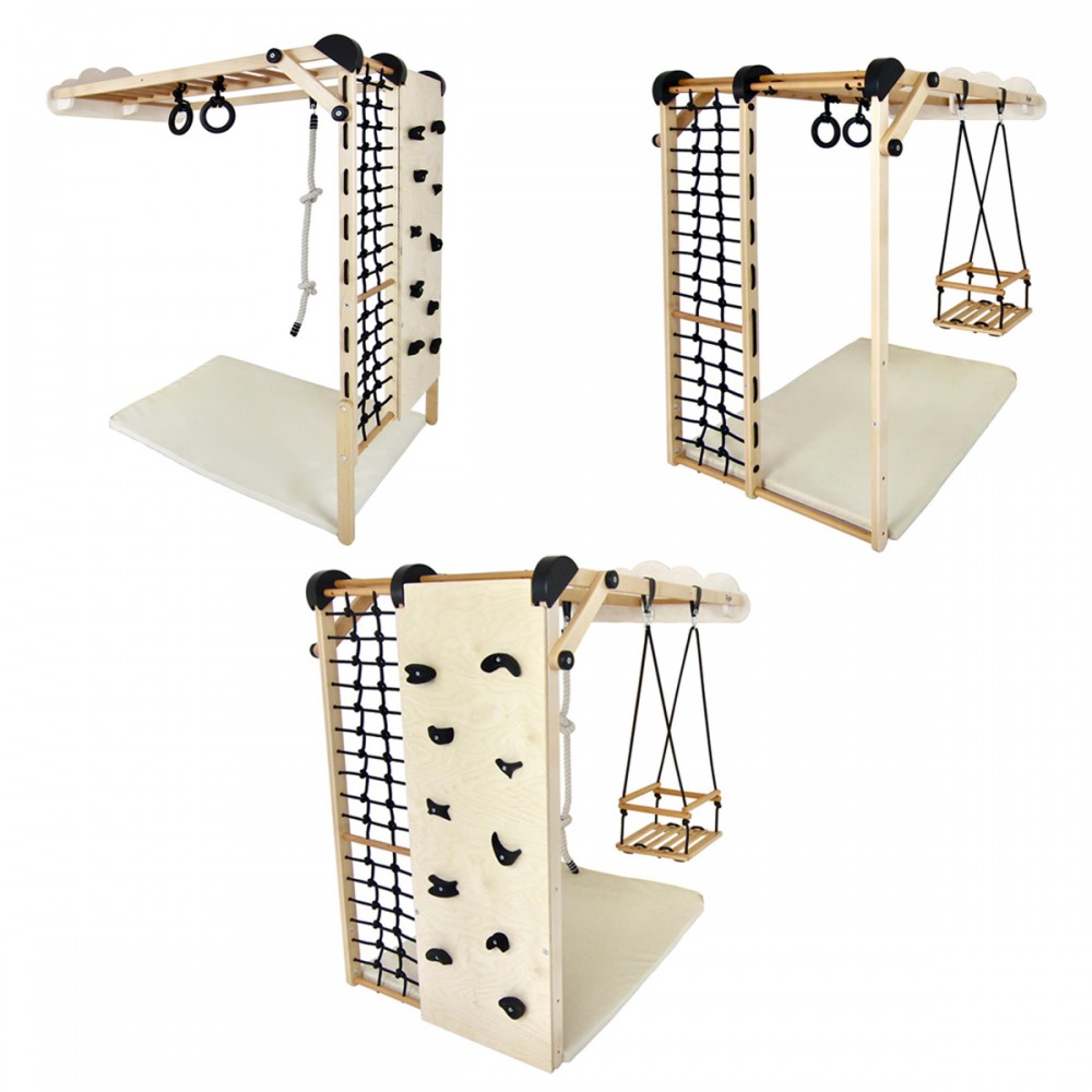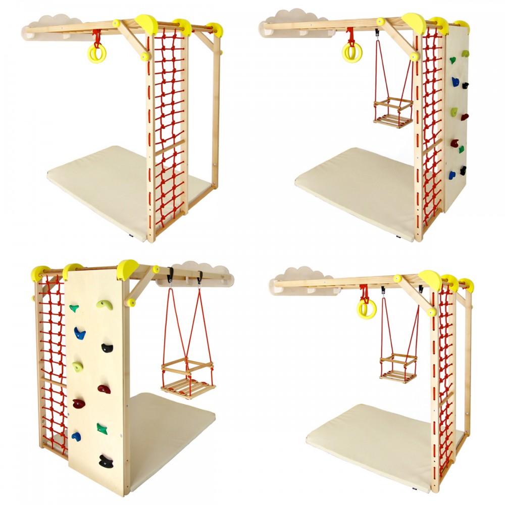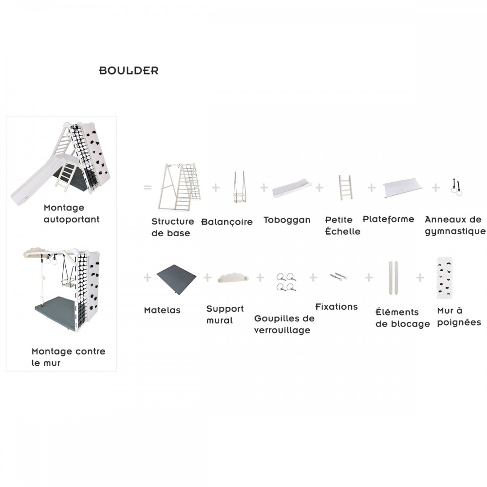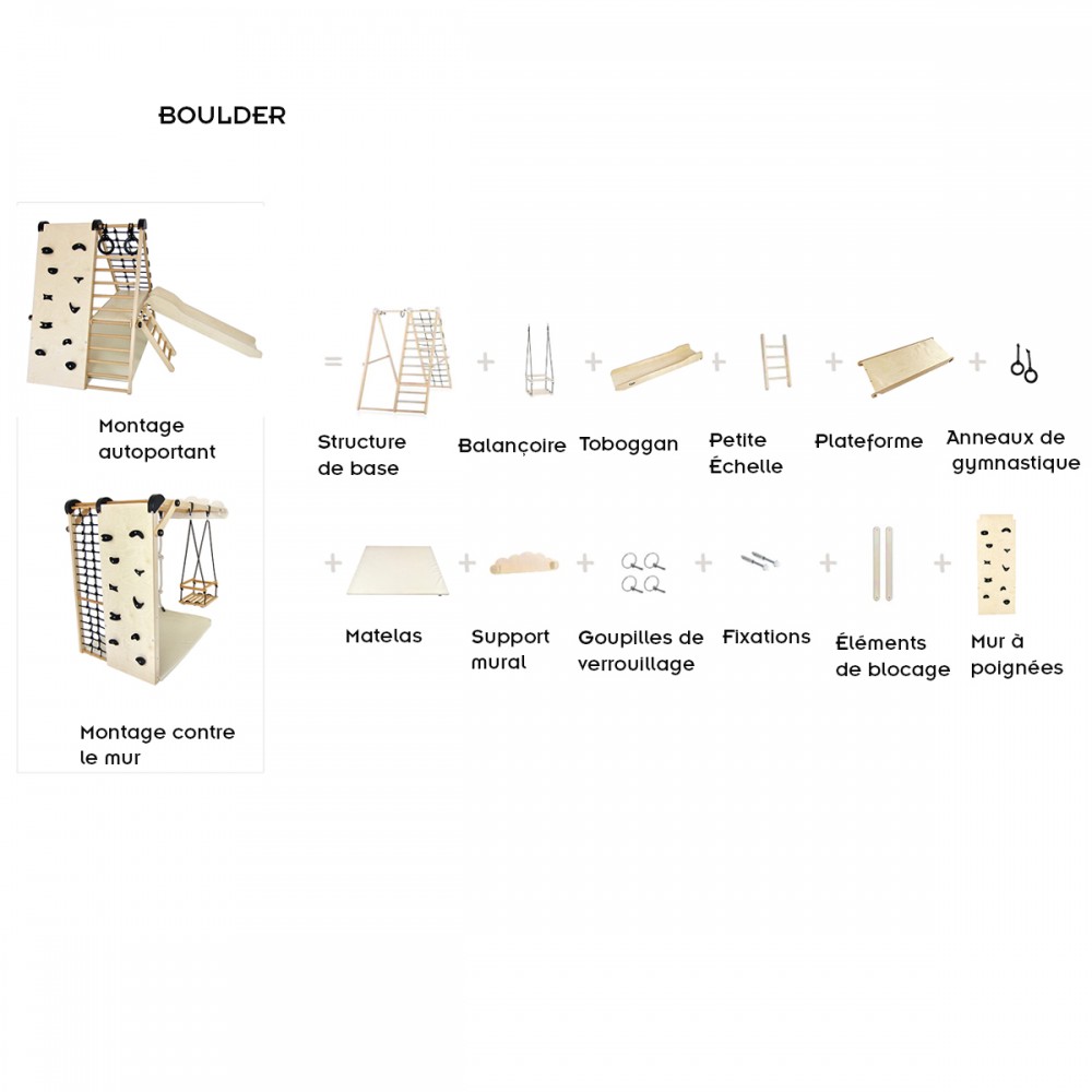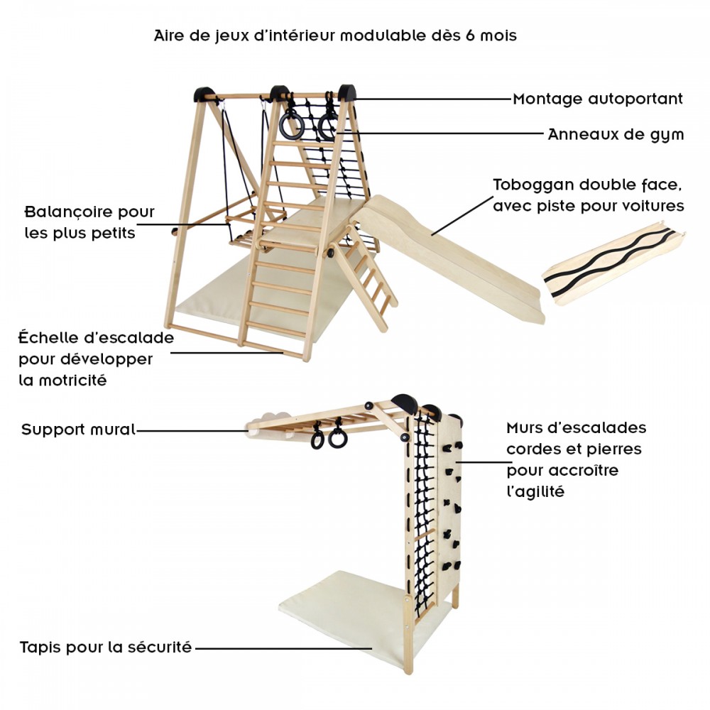 | bulletpointA | Aire de jeux en bois pour enfants dès 6 mois pour l'intérieur. Structure modulable en version murale et autoportée. |