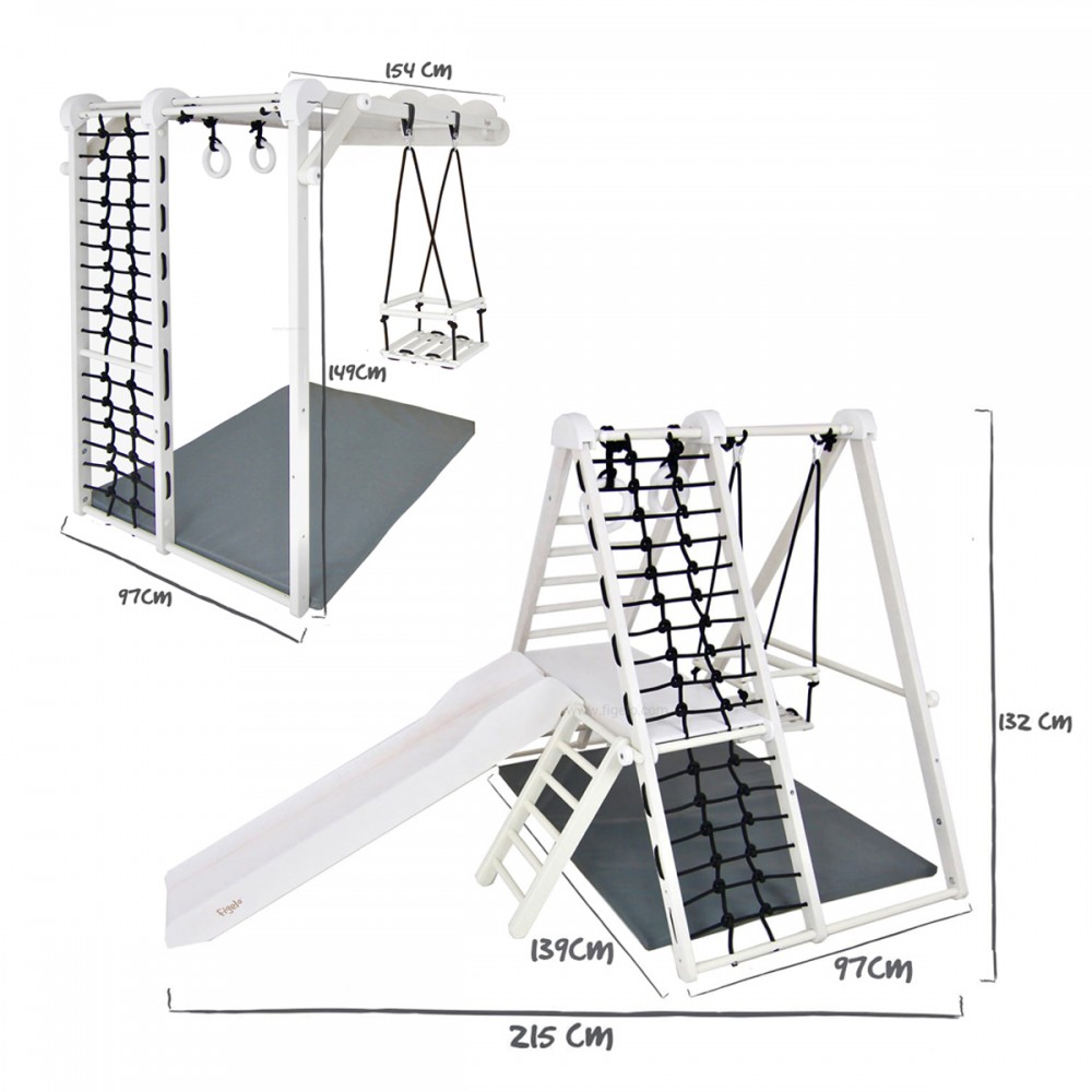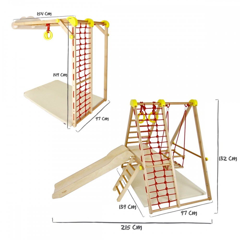 | bulletpointB | Complexe sportif composé d'1 balançoire, d'1 mur de corde et d'escalade, d'1 toboggan et de 2 anneaux de gymnastique. |