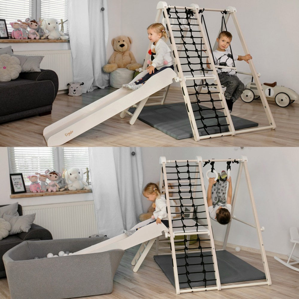 Dès 6 mois, les plus petits pourront s’adonner à leurs divertissements favoris : balançoire, toboggan... Les plus grands pourront développer leur agilité à l’aide de la grande échelle, du mur d’escalade, du filet en cordes. Deux anneaux de gymnastique leur permettront de jouer aux petits acrobates.