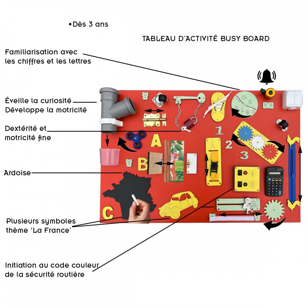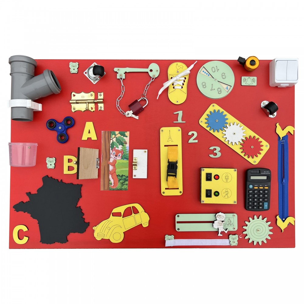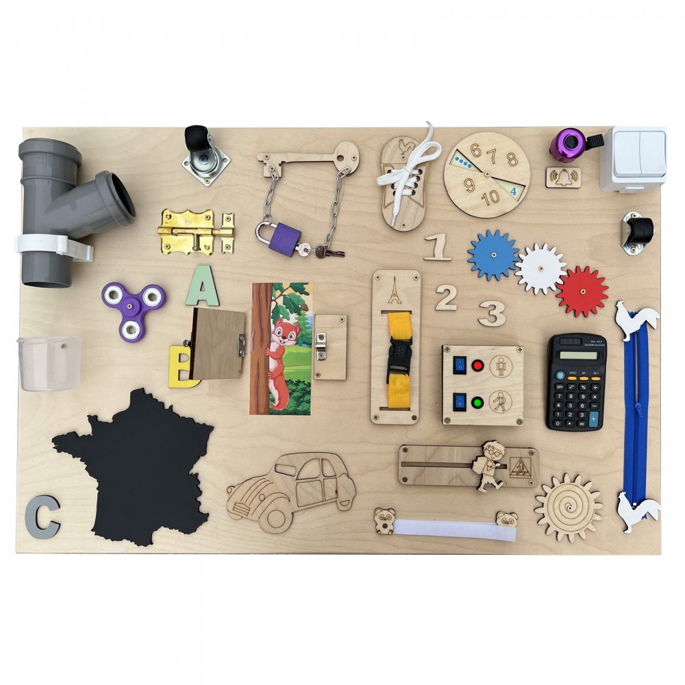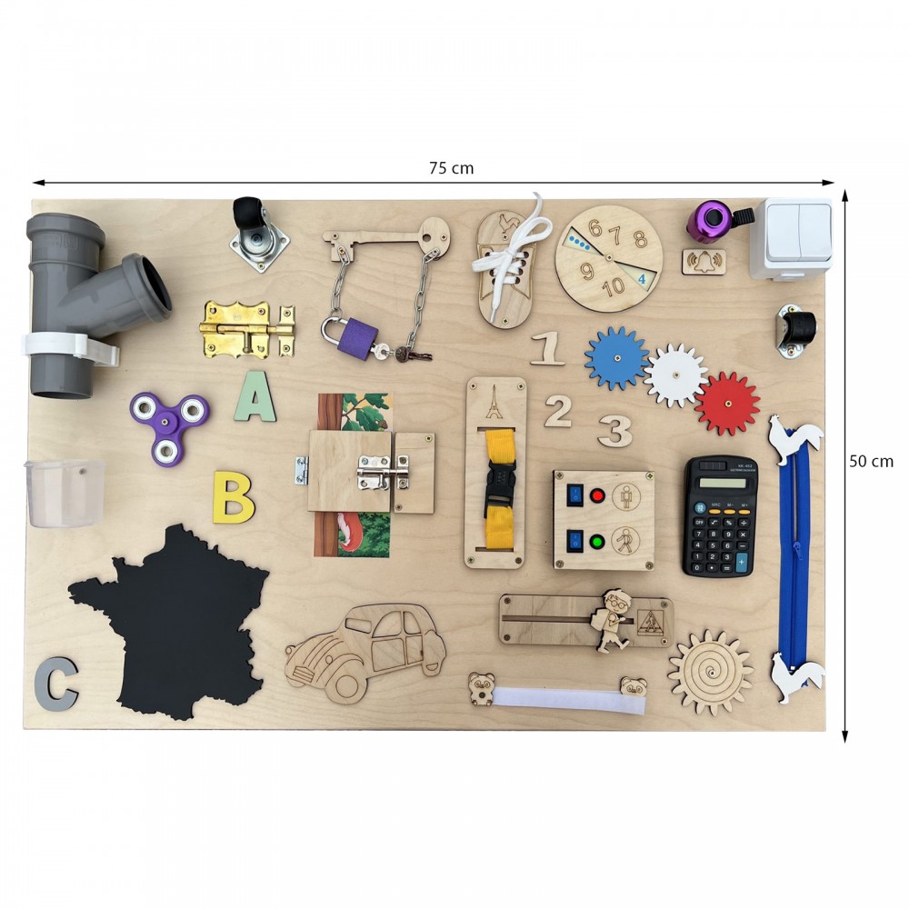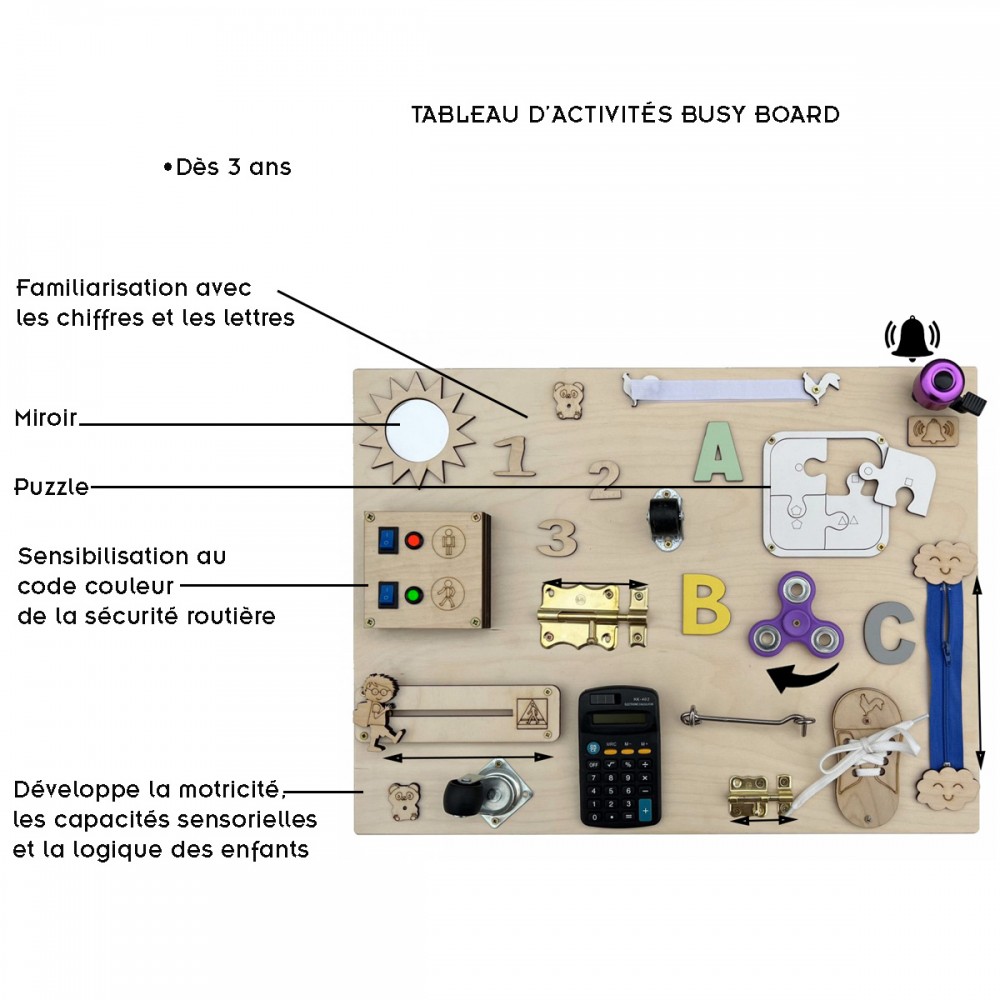 Calculatrice, lacets, roulettes, puzzle, fermeture éclair, loquets de verrouillage, hand spinner, sonnette, miroir, engrenages, ardoise avec craie, cadenas, scratch velcro, boucle de sangle à clipser, formes, interrupteur.