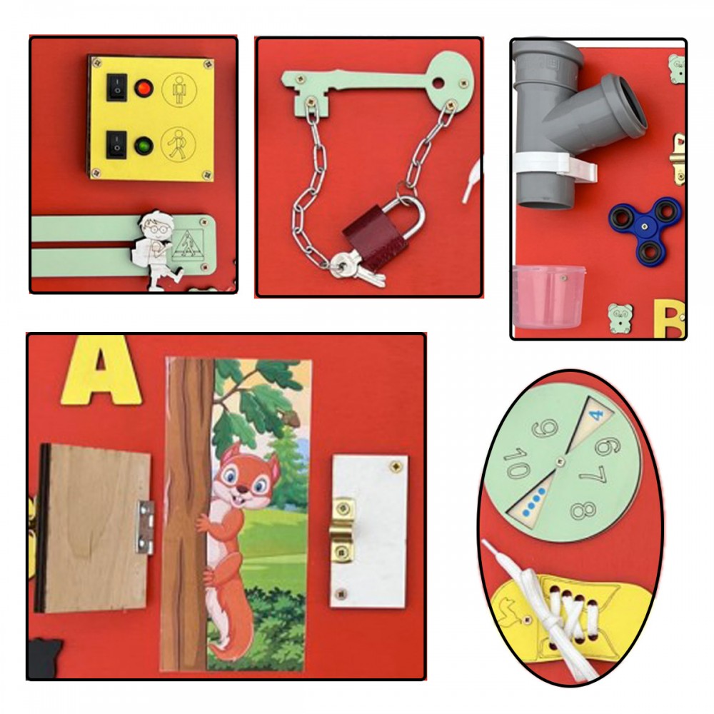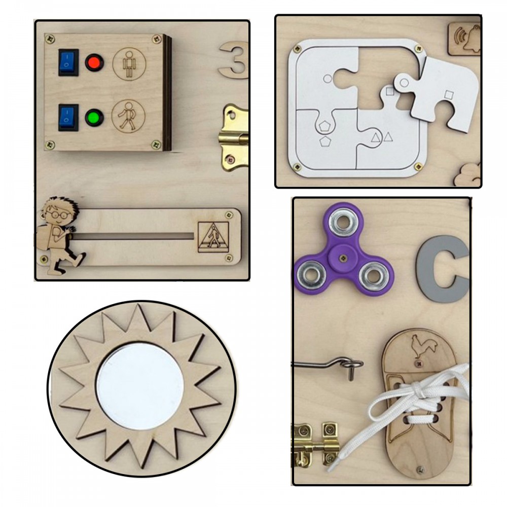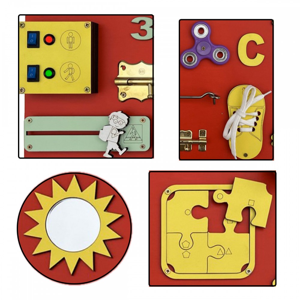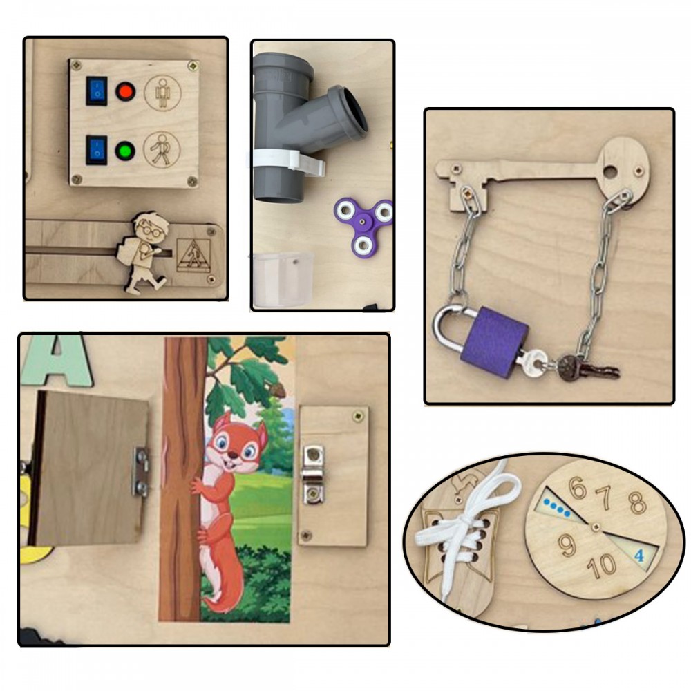 Calculatrice, lacets, roulettes, puzzle, fermeture éclair, loquets de verrouillage, hand spinner, sonnette, miroir, engrenages, ardoise avec craie, cadenas, scratch velcro, boucle de sangle à clipser, formes, interrupteur.