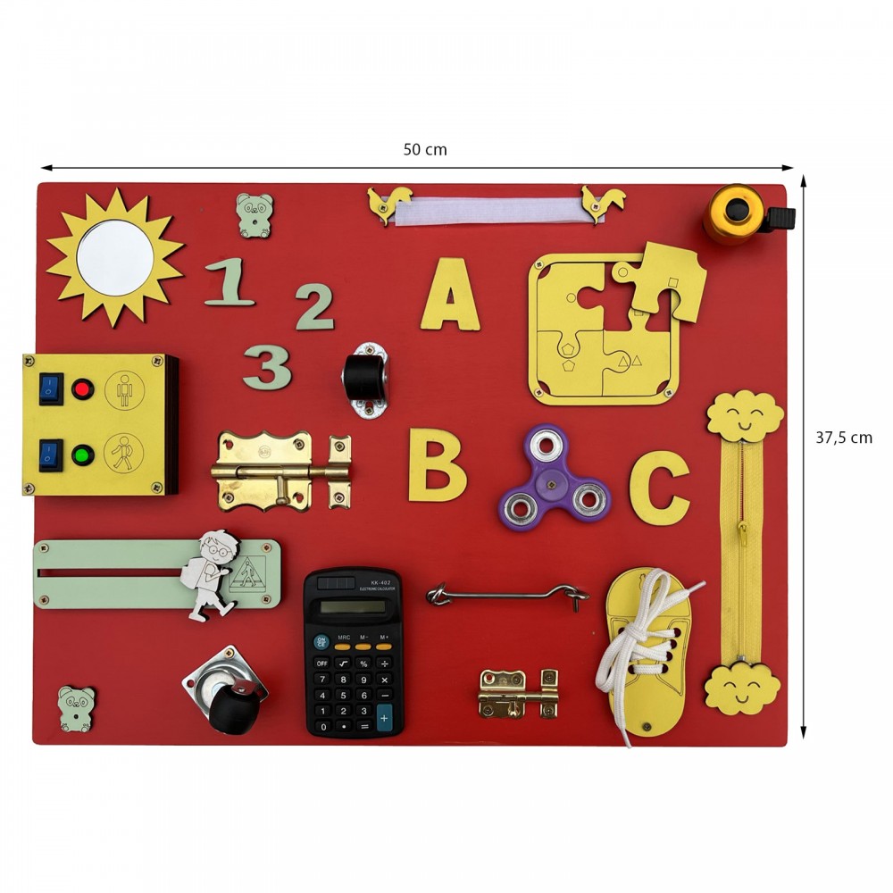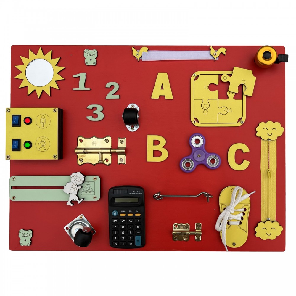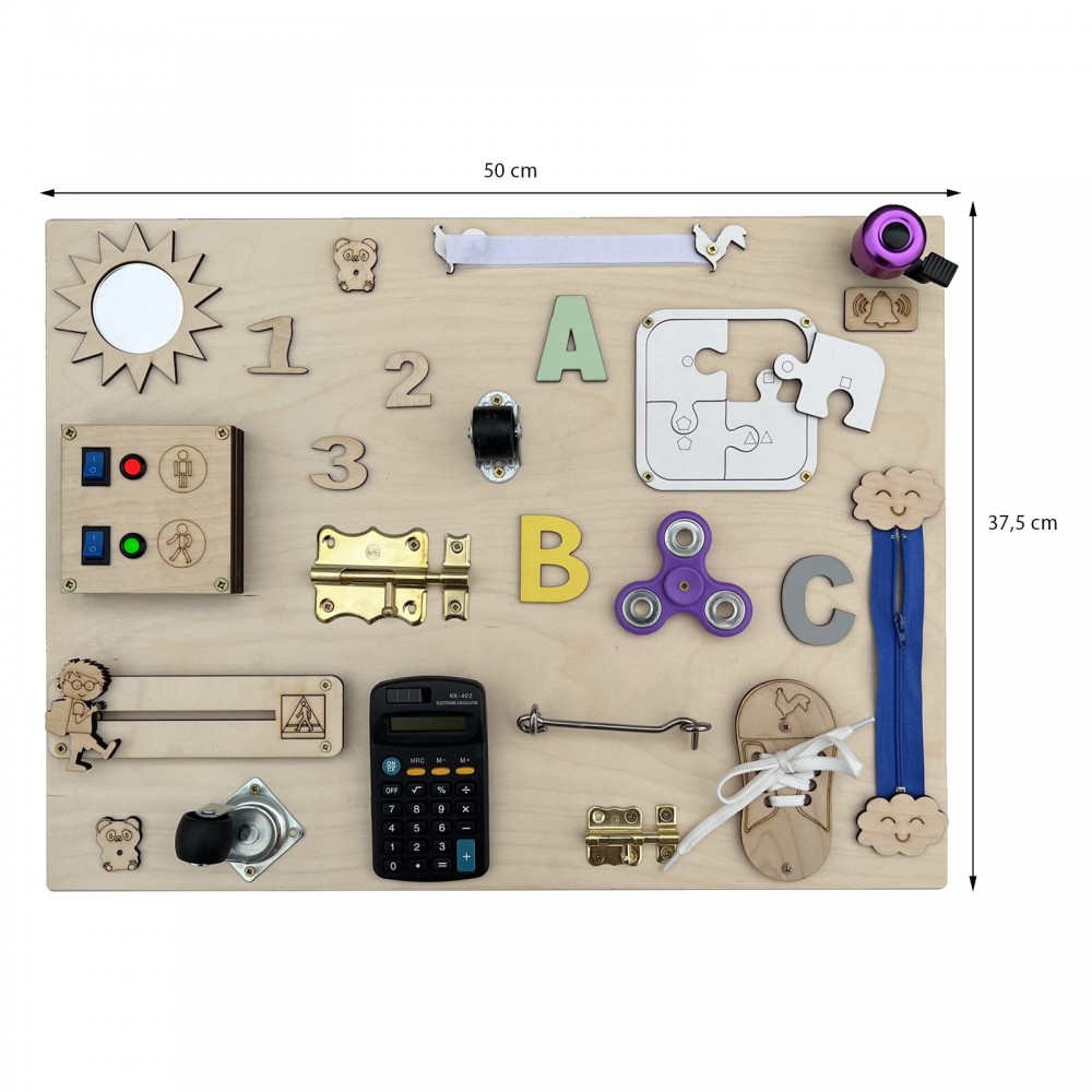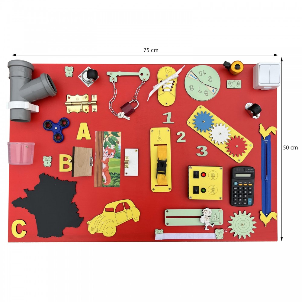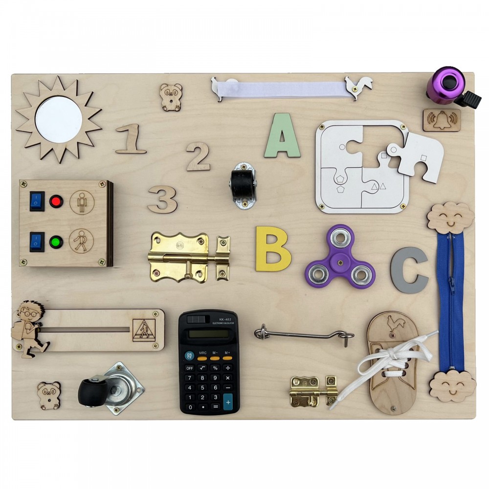 Calculatrice, lacets, roulettes, puzzle, fermeture éclair, loquets de verrouillage, hand spinner, sonnette, miroir, engrenages, ardoise avec craie, cadenas, scratch velcro, boucle de sangle à clipser, formes, interrupteur.