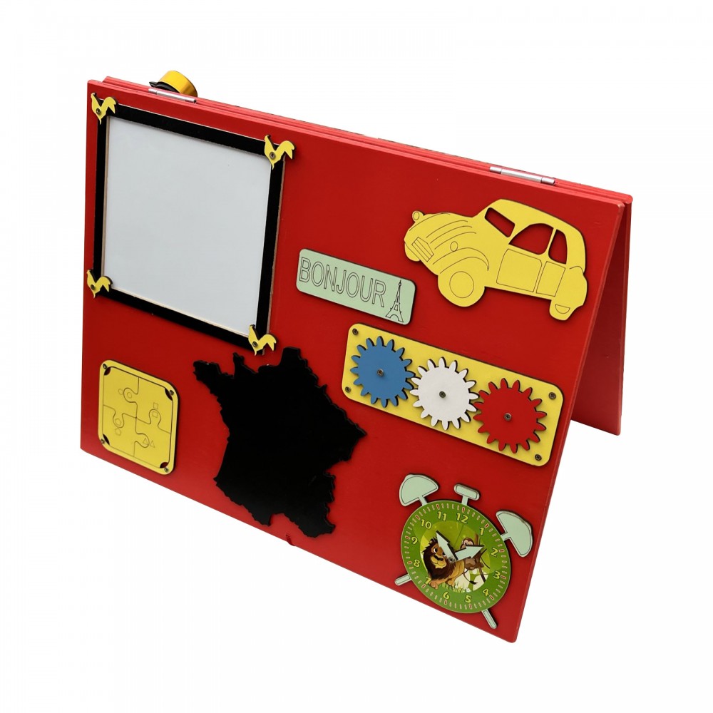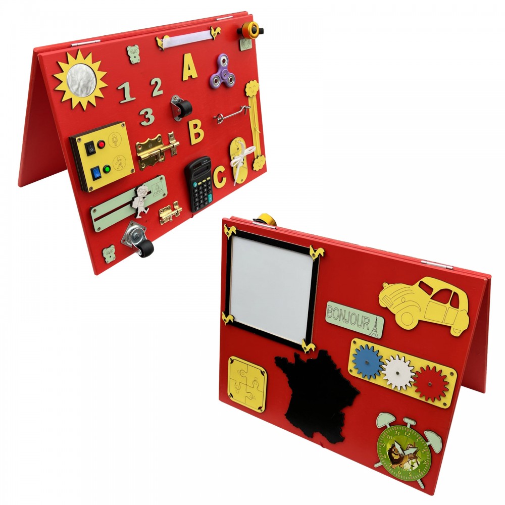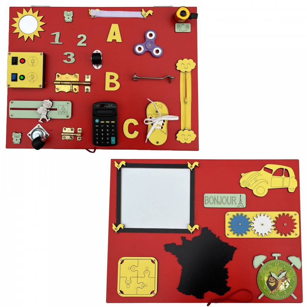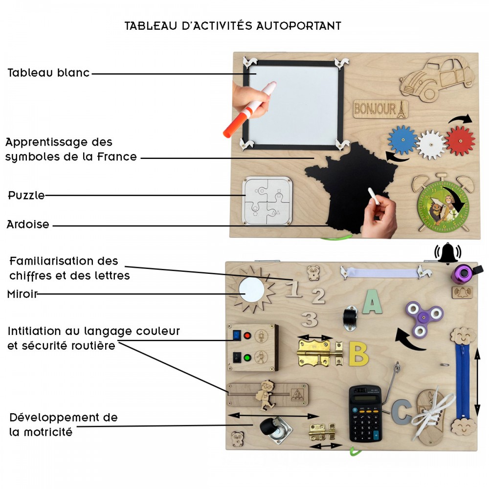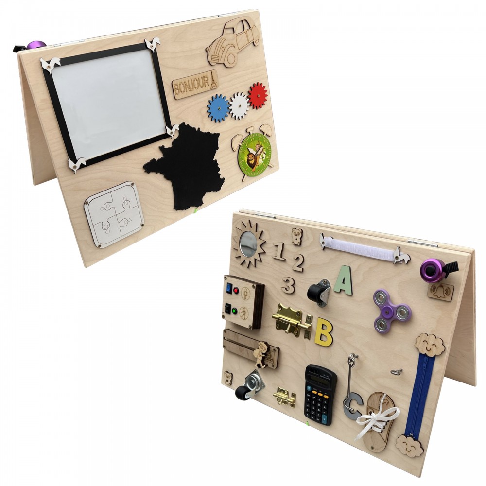 Tableau blanc, engrenage tricolore, puzzle, ardoise, horloge, miroir, sonnette, fermeture éclair, roulettes, loquets, scratch, boutons, calculatrice, hand spinner, crochets.