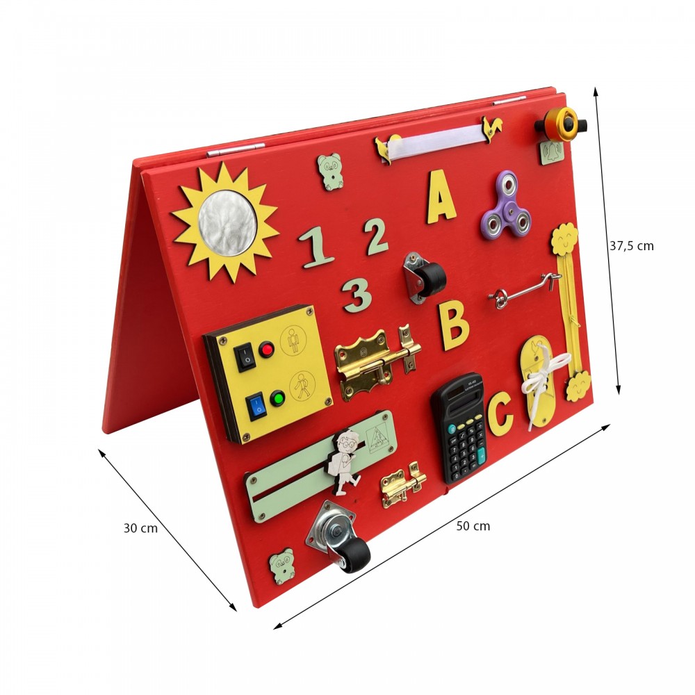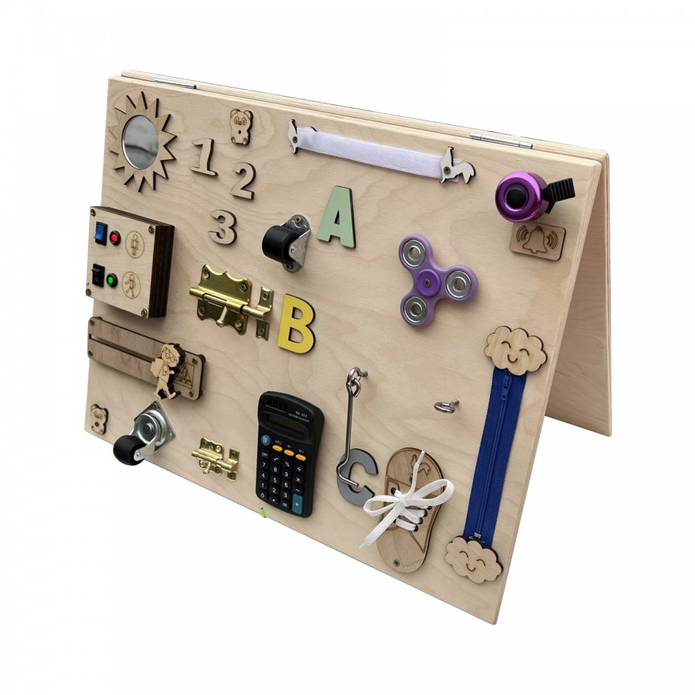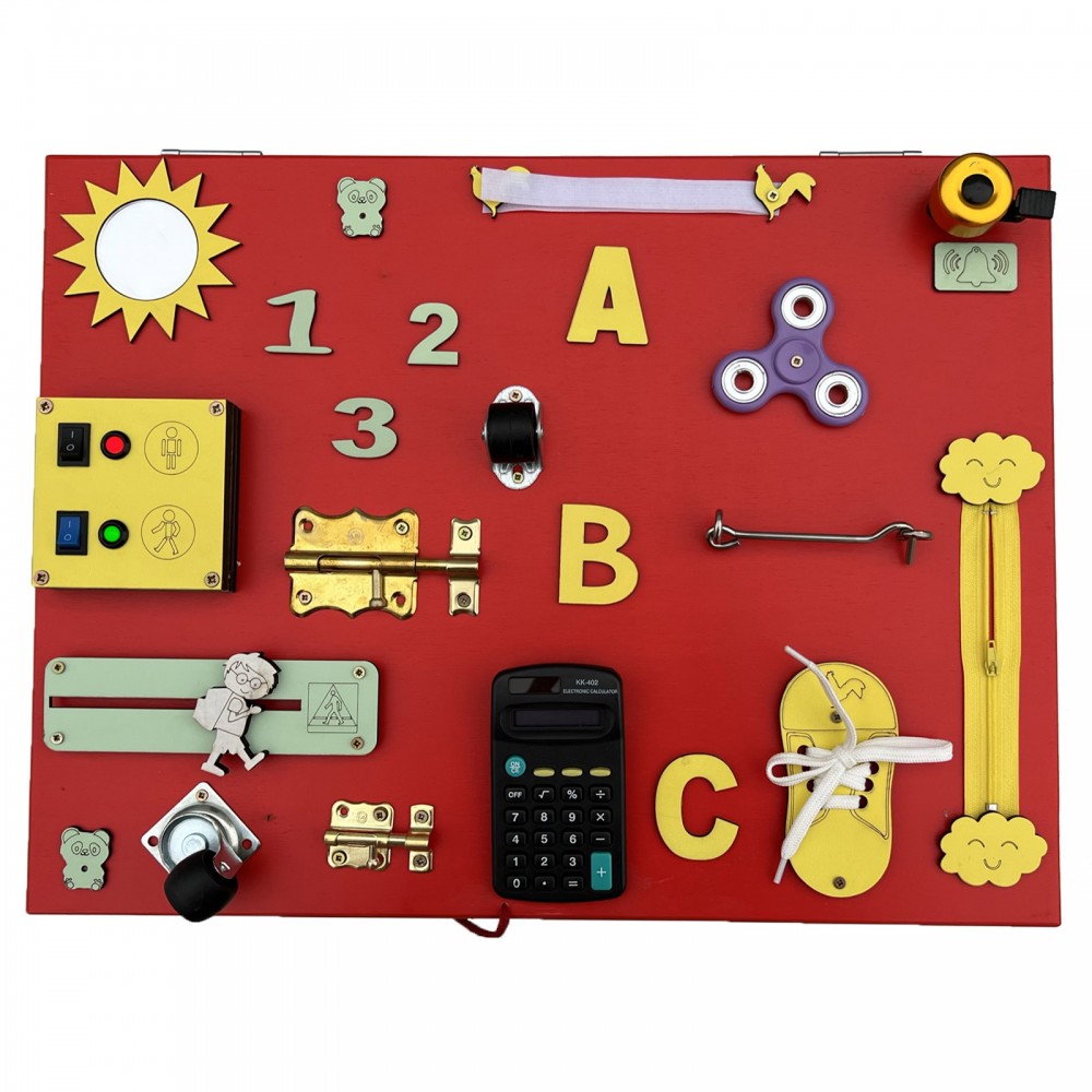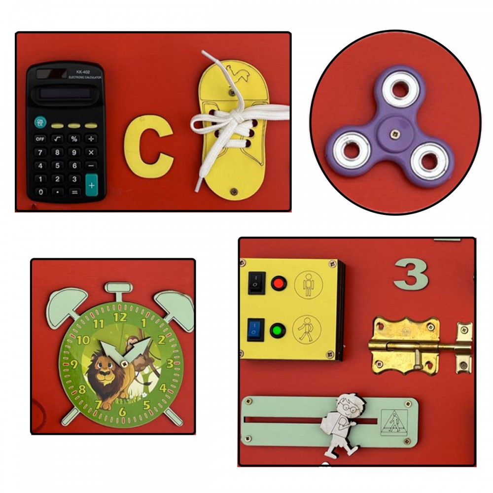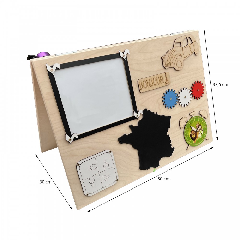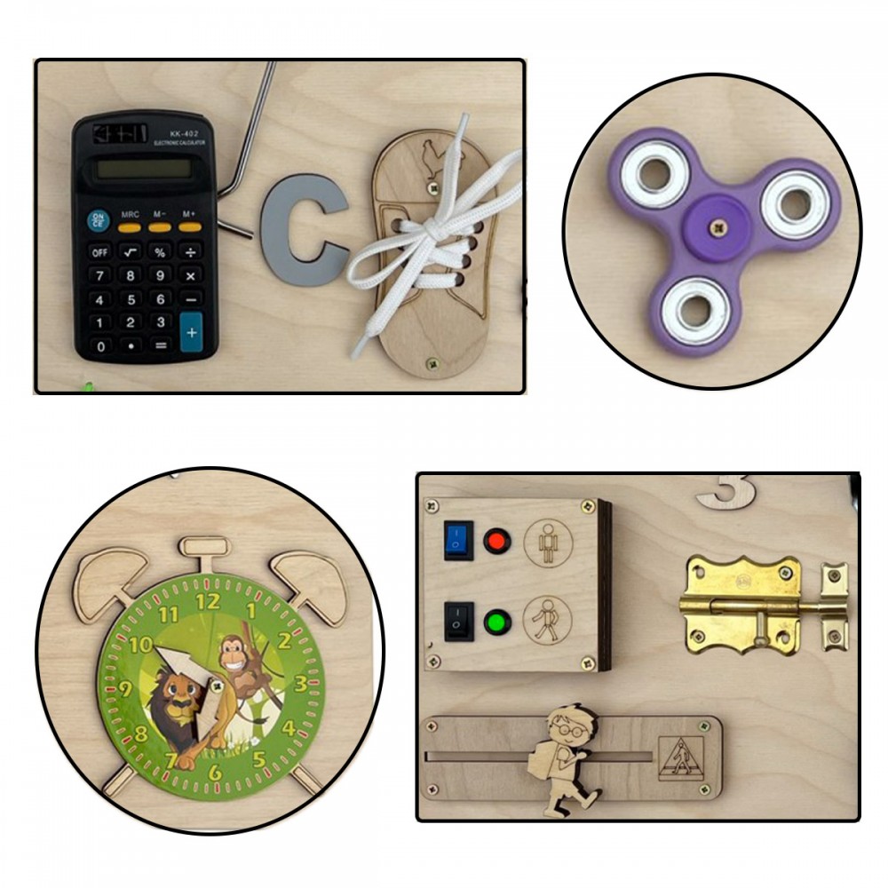 Tableau blanc, engrenage tricolore, puzzle, ardoise, horloge, miroir, sonnette, fermeture éclair, roulettes, loquets, scratch, boutons, calculatrice, hand spinner, crochets.