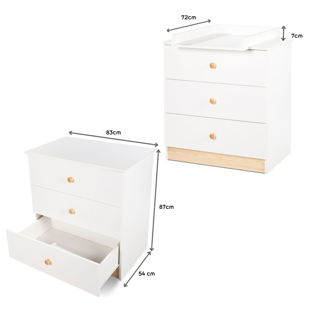 | bulletpointA | Commode à langer avec 3 tiroirs. Le plan à langer amovible peut être retiré lorsque bébé grandit. |