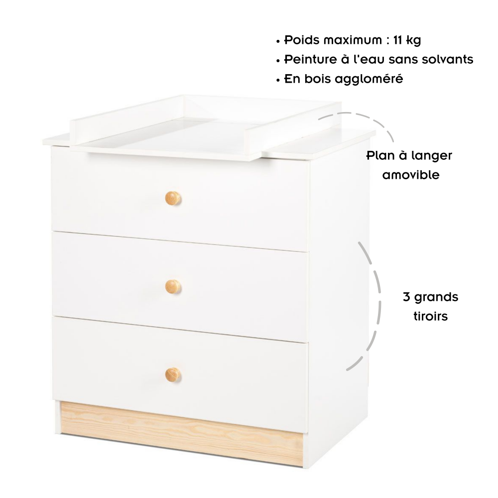 | bulletpointC | La commode à langer comprend 3 tiroirs. Le plan à langer peut être retiré quand votre enfant grandit. |