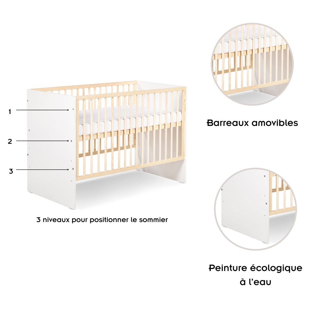 | bulletpointB | Lit évolutif avec sommier réglable sur 3 hauteurs. 3 barreaux amovibles permettent aux enfants plus âgés d'entrer/sortir du lit. |