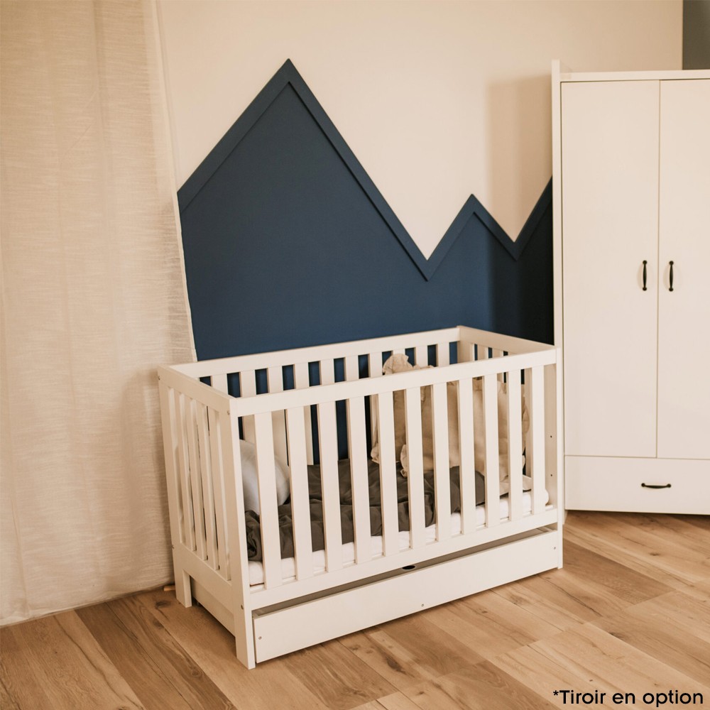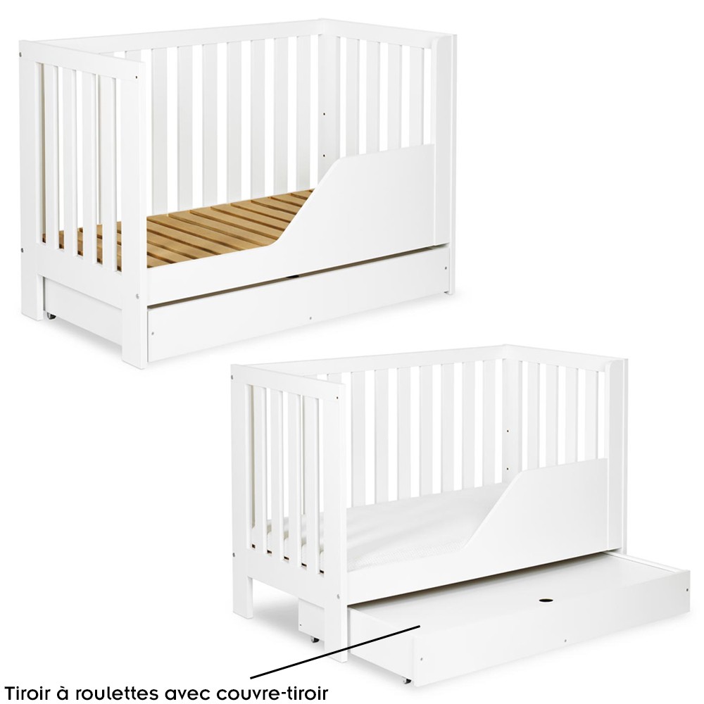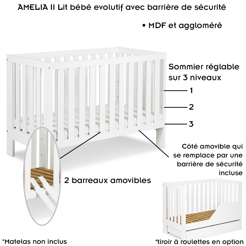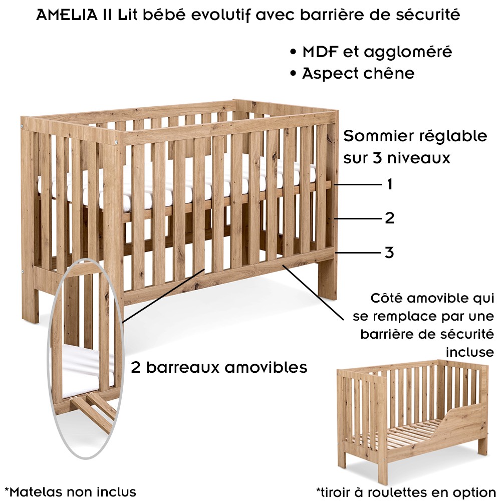 Ce lit est évolutif et suit la croissance de votre enfant. Son sommier à lattes se règle sur 3 hauteurs différentes afin de s’adapter à l’âge de l’enfant. 2 barreaux sont amovibles afin de faciliter l'entrée et la sortie de l'enfant. De plus, un côté est entièrement amovible et est remplaçable par une barrière de sécurité.