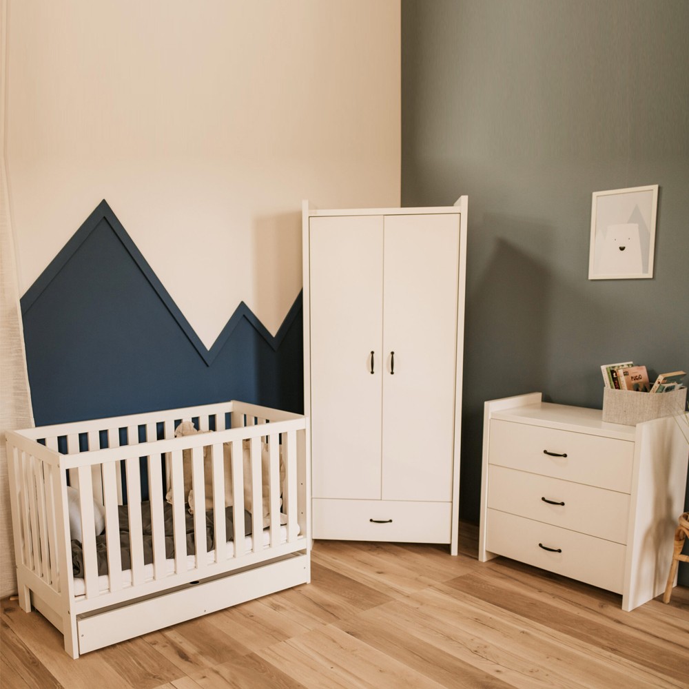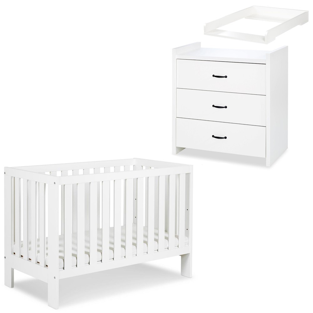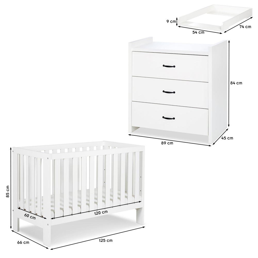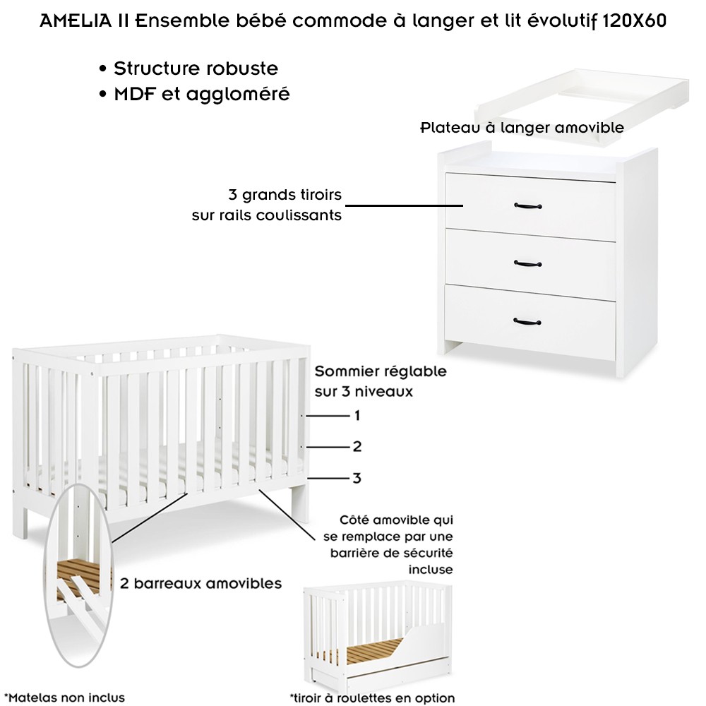 | bulletpointA | Ensemble lit évolutif 120x60 cm et commode à langer 3 tiroirs avec plan à langer amovible. |
