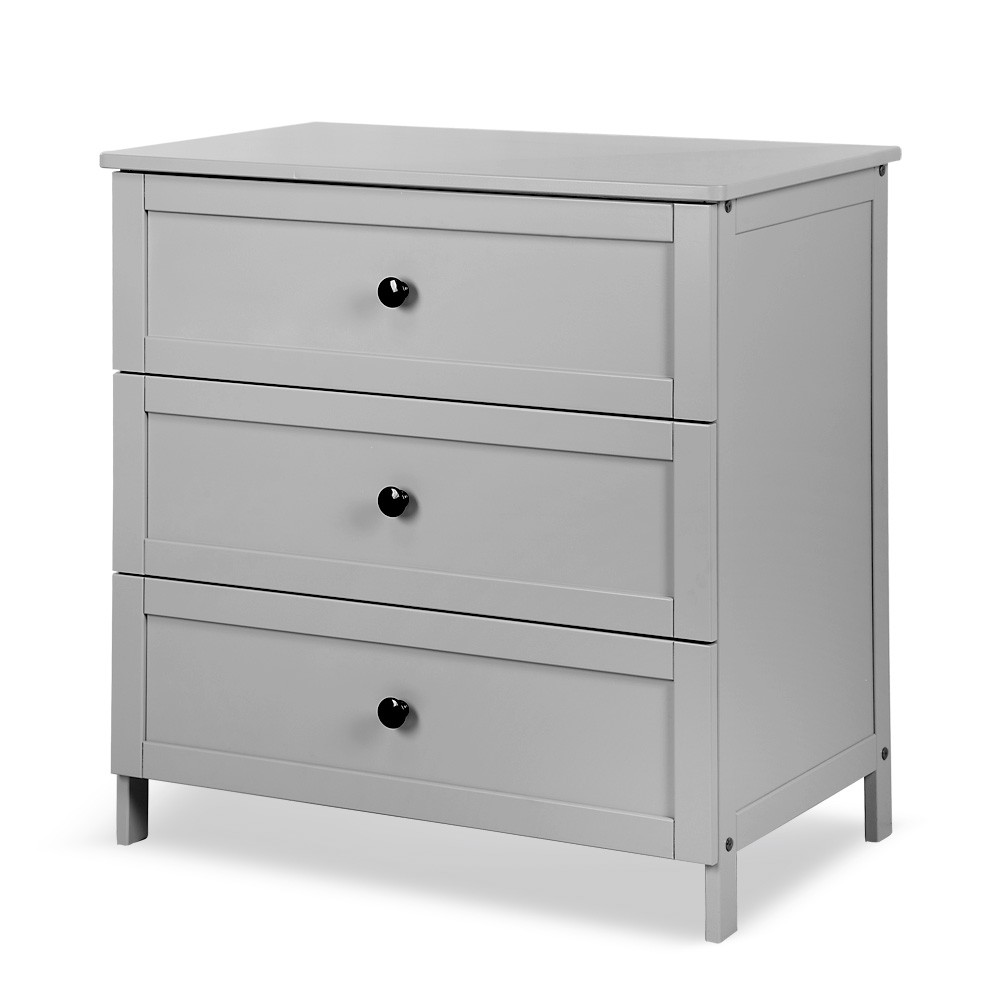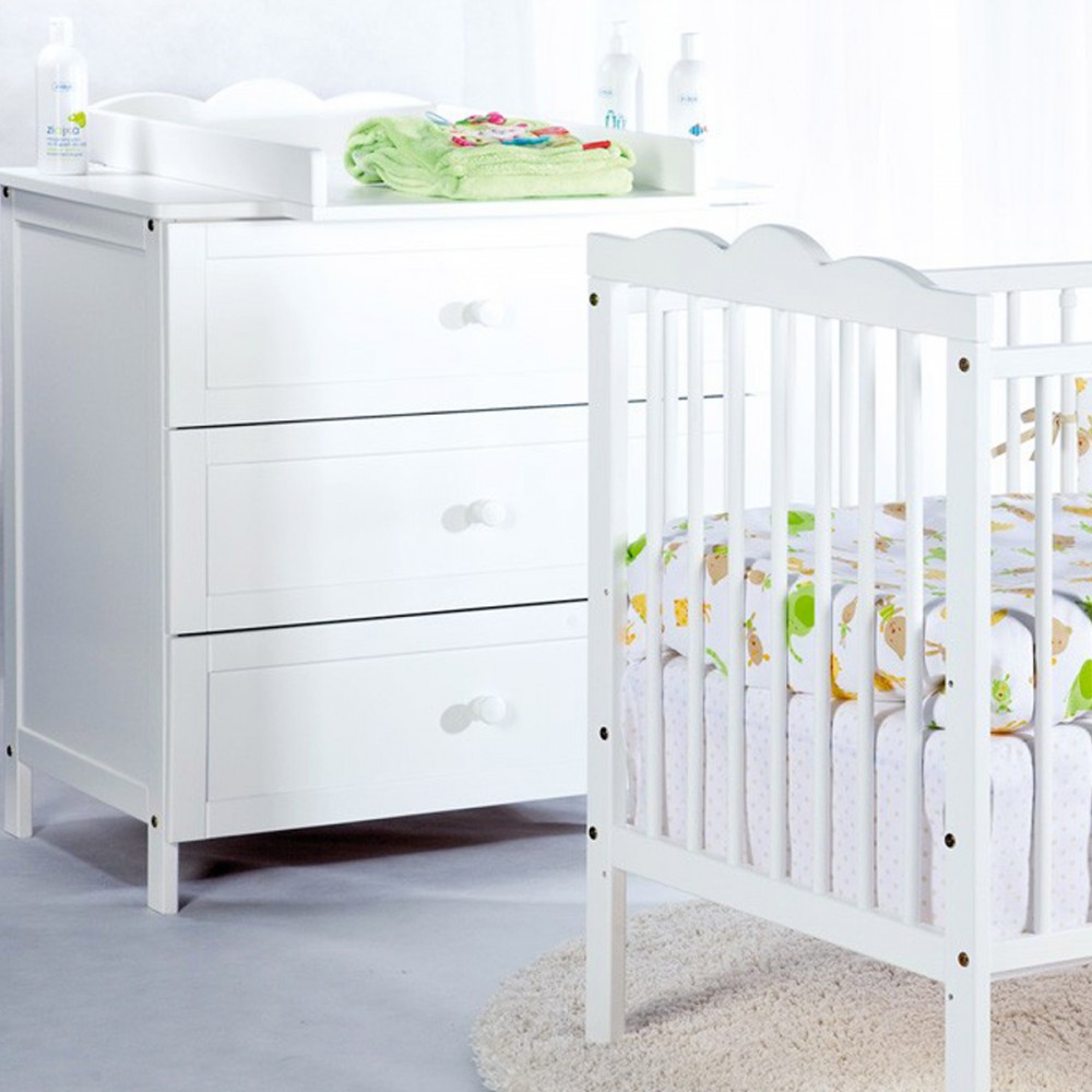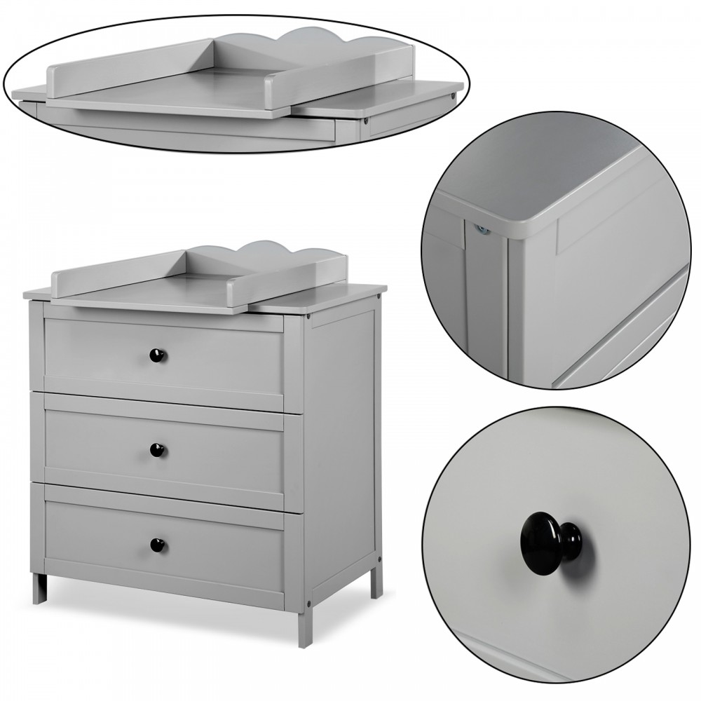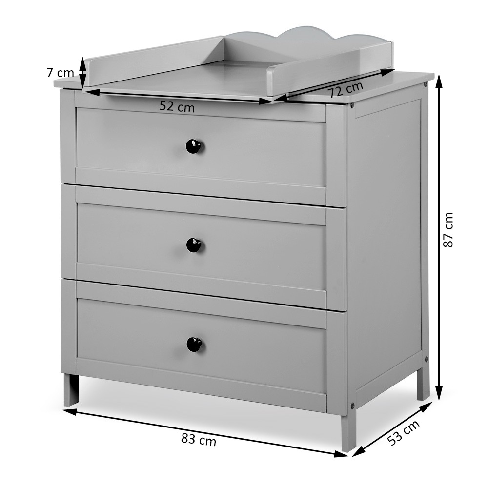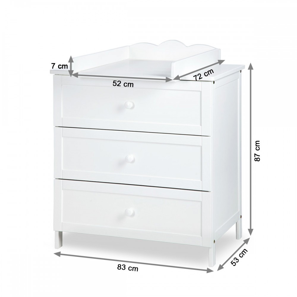 La commode dispose de trois grands tiroirs et d'une planche à langer amovible. Commode en bois de pin massif et tiroir et fond de tiroir en MDF. Conforme aux normes de sécurité européennes. La commode à langer est peinte avec de la peinture à l'eau, sans solvant, non toxique pour les enfants.