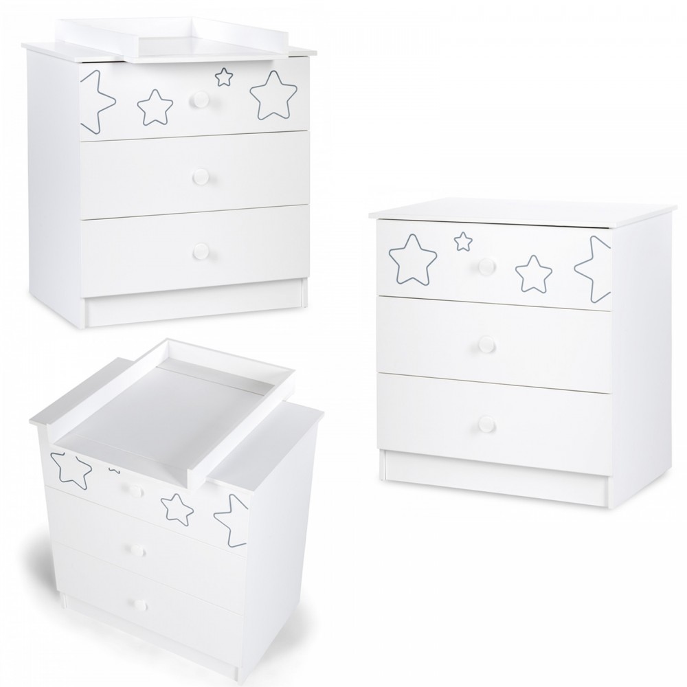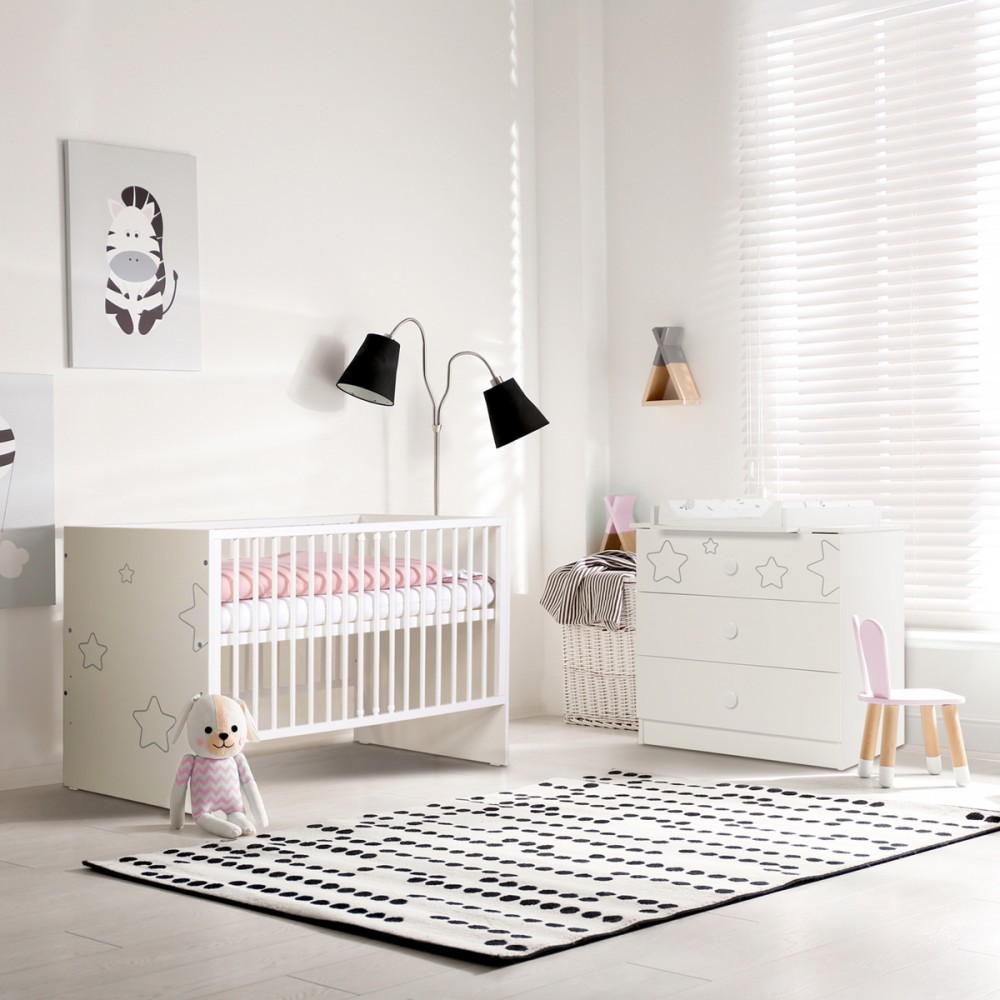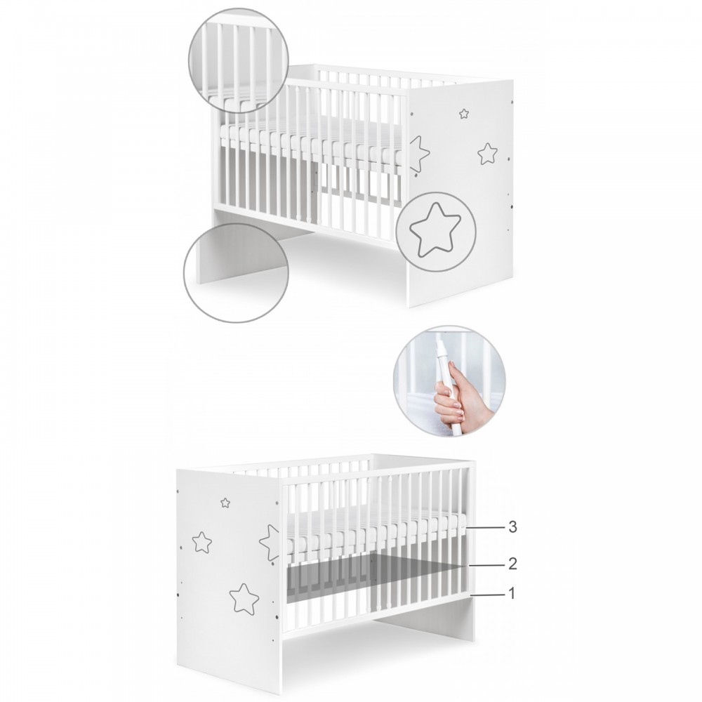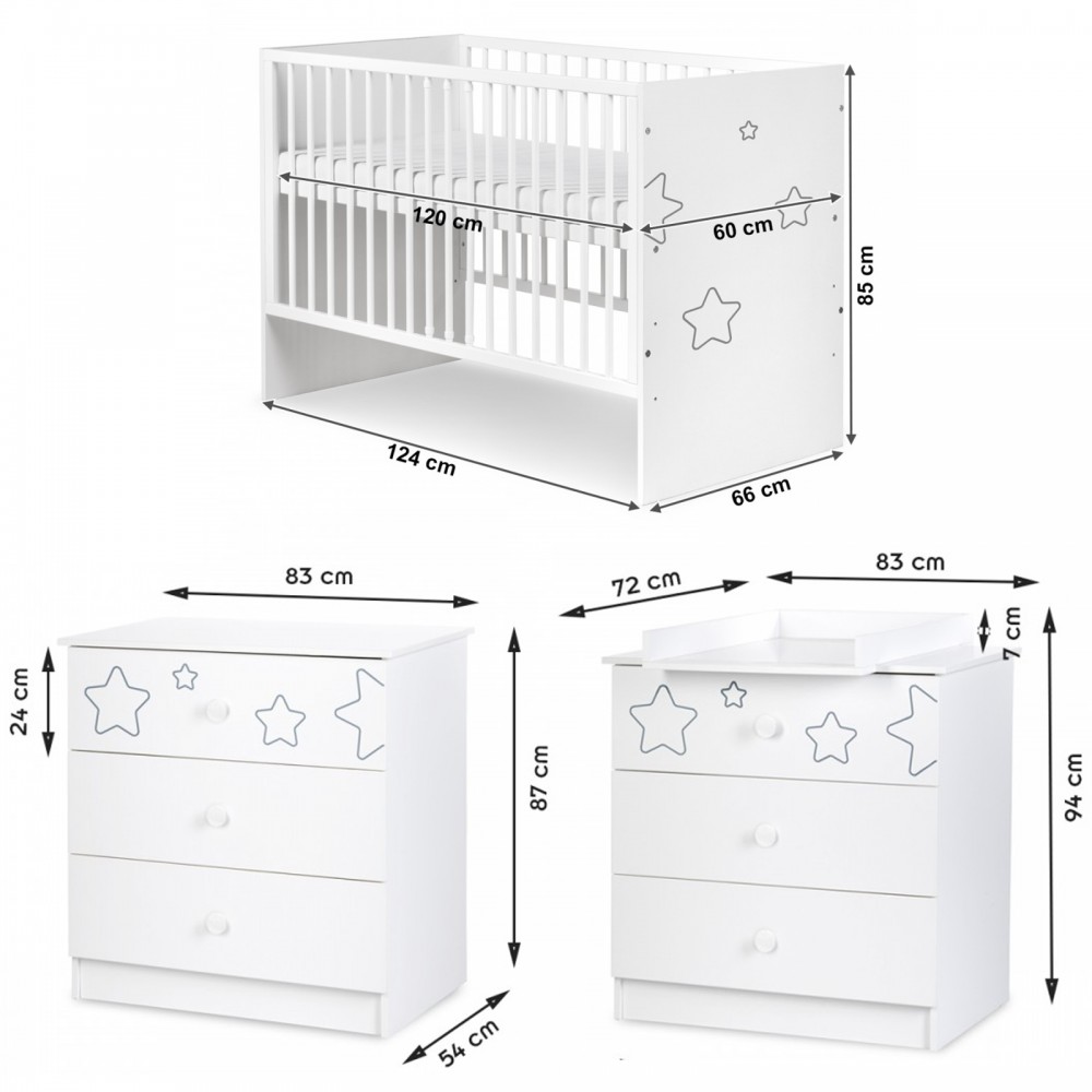 | bulletpointA | Ensemble lit 120x60 cm et commode à langer motif étoiles utilisable de la naissance à 3 ans. |