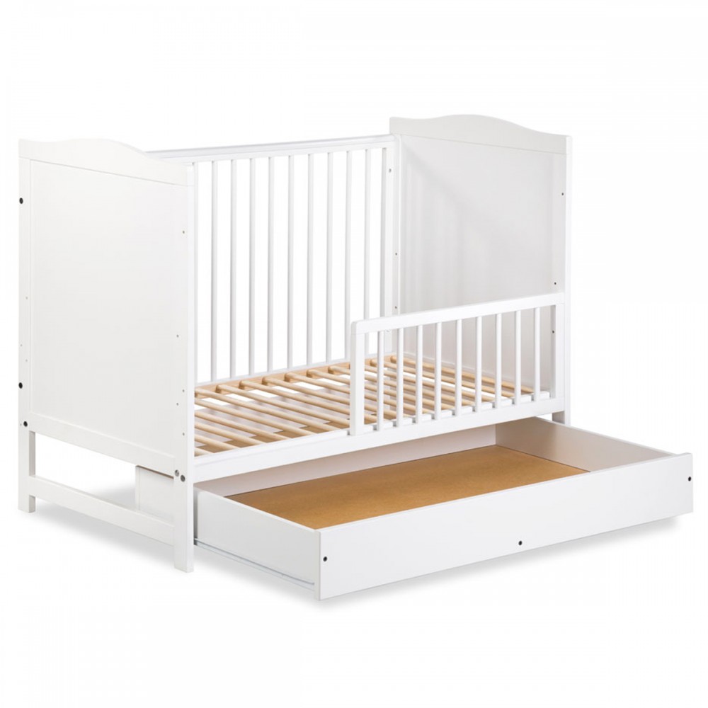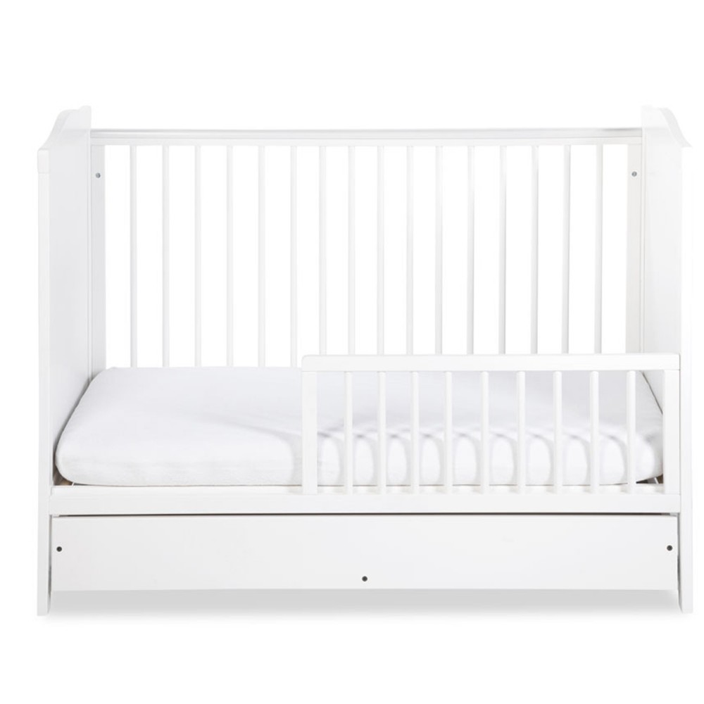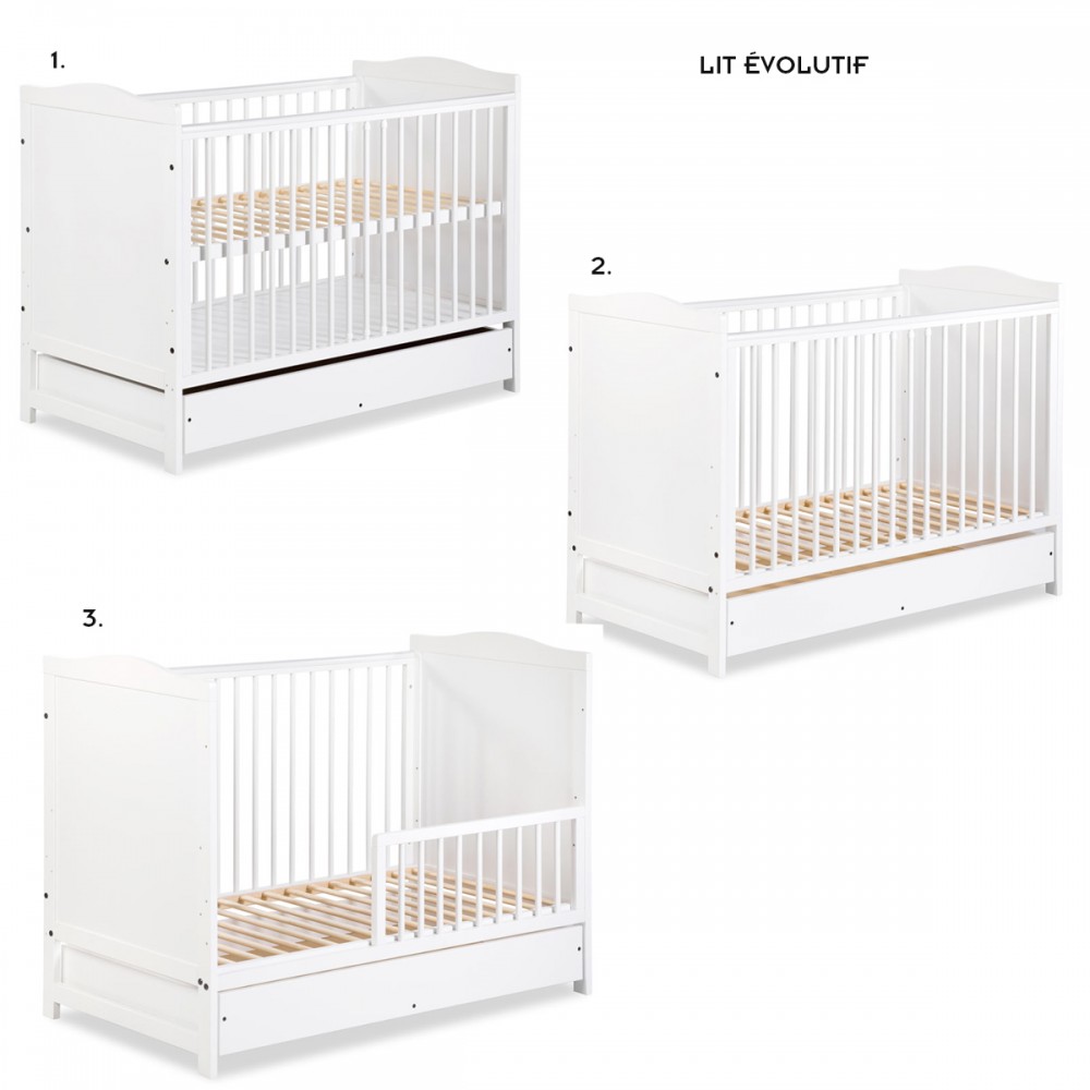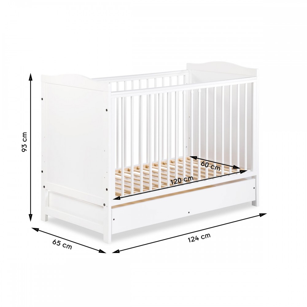 | bulletpointA | Lit évolutif bébé en bois de pin blanc 120x60 cm avec un tiroir équipé de rails coulissants. |